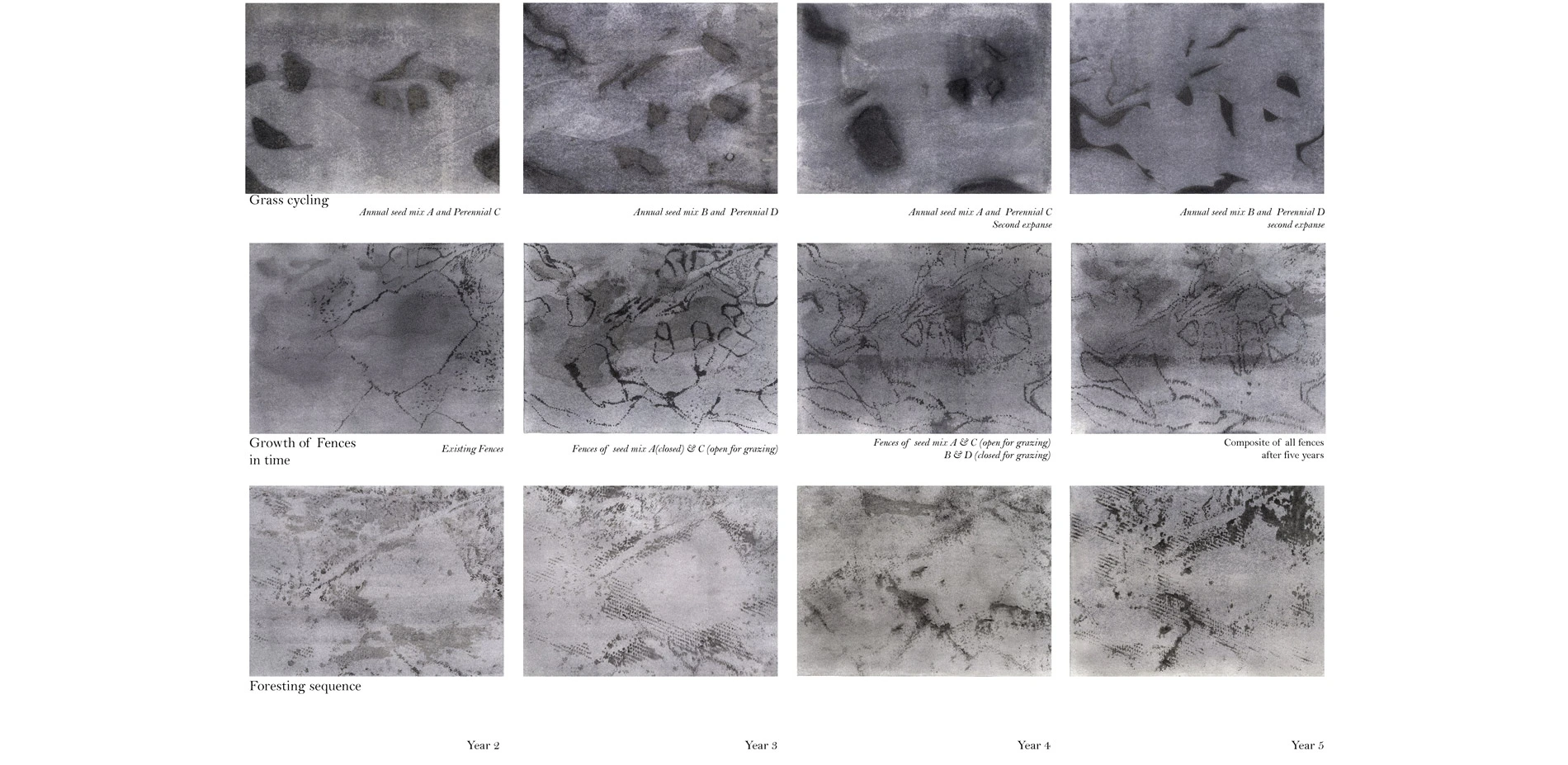 Apart from built structures and a robust detail of grass cycling and alternate fencing was needed, to contain overgrazing. The grass cycling consists of seed mixes divided into annual a and b, & perennials c and d.