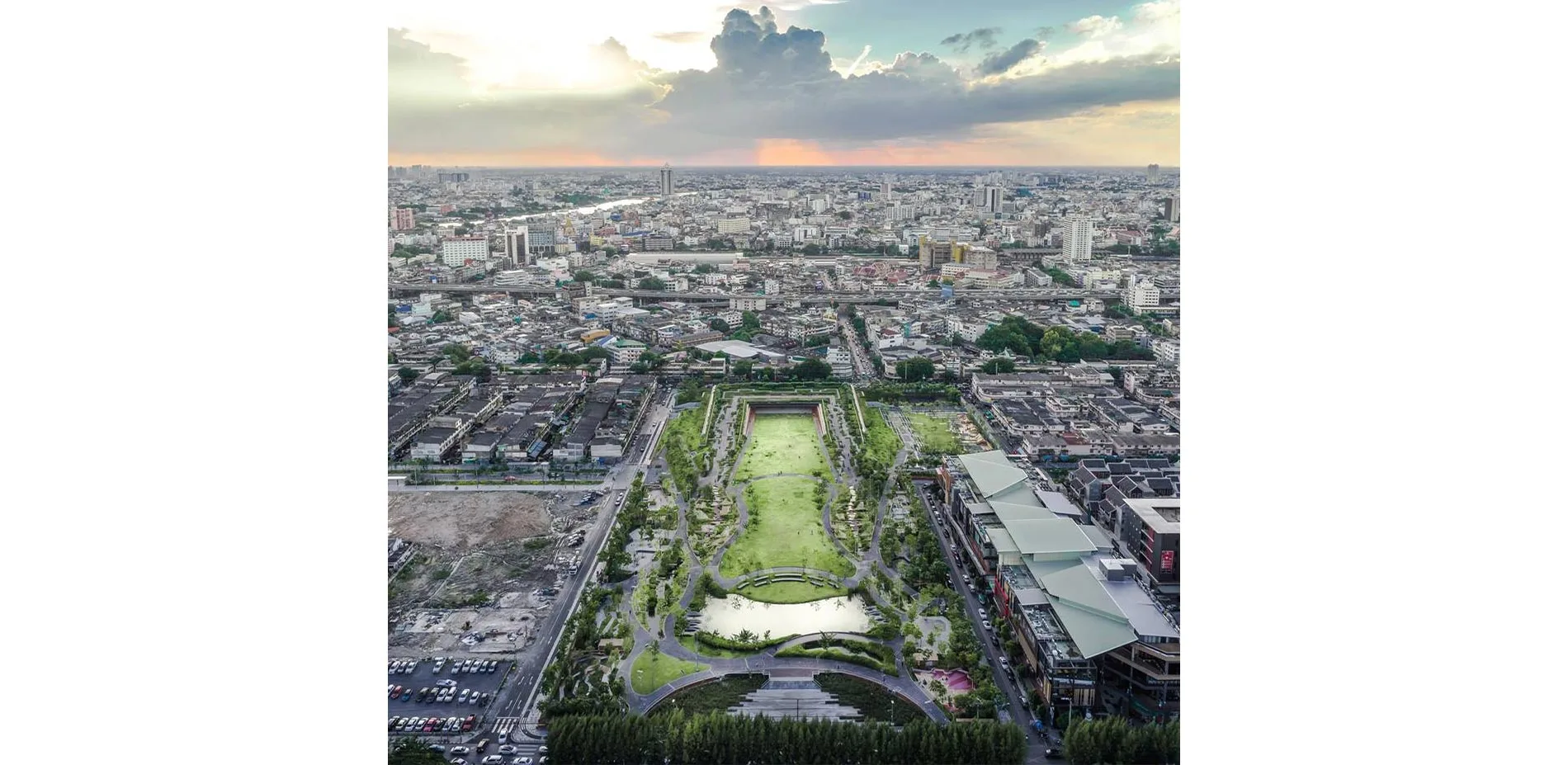 For the first time in 30 years of rapid development, an enormously valuable property in the heart of Bangkok was not turned into another block for commercial use. Instead, it was designed as a vast public park that is the epitome of green infrastructure. Designed for beauty and active public use, it also does the complex work of mitigating urban flooding and responding to climate change in a region that faces severe environmental challenges. The 11-acre park includes wetlands, detention lawns, a retention pond, and the biggest green roof in Thailand, all integrated into dynamic public spaces where people can enjoy playgrounds, an amphitheater, gardens, and meditation areas. Bold concepts strike a balance with small, intimate moments, reminding the world that landscape architecture can help a city under threat learn to live with water, rather than fear it.