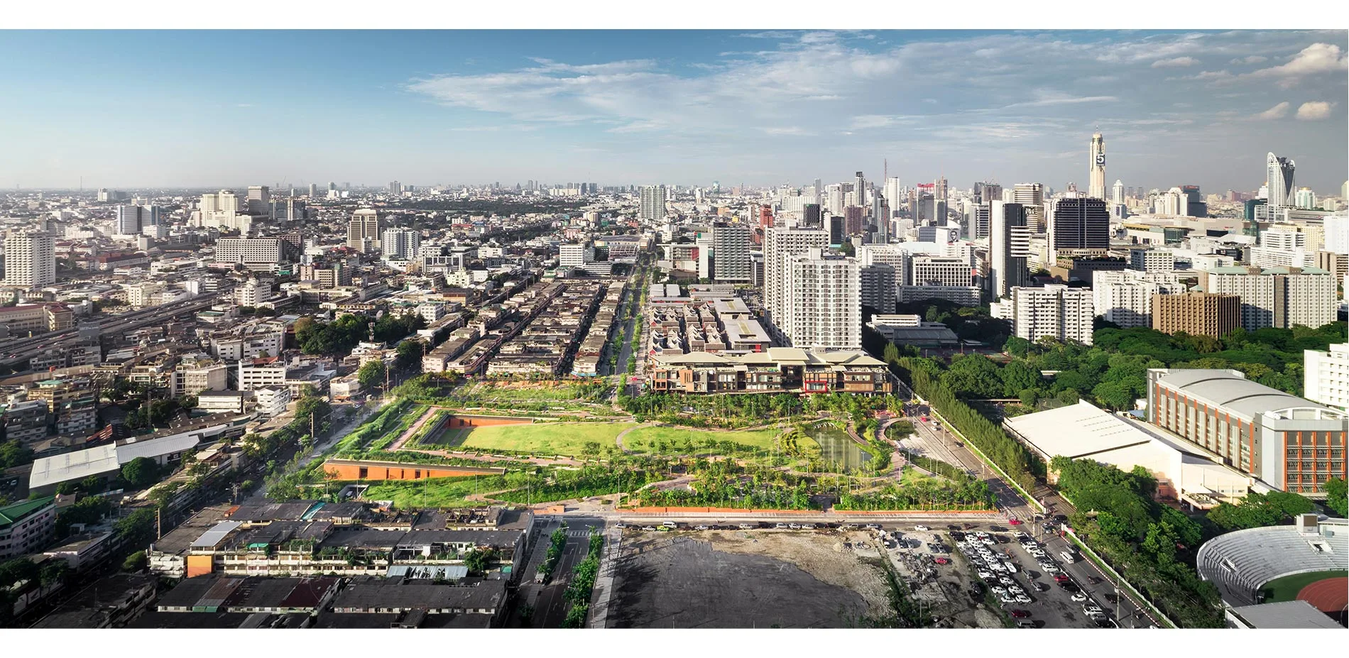 For the first time in 30 years, a priceless plot at the center of Bangkok's commercial district—11 acres of land with a 1.3-kilometer stretch of road worth US$700 million—was not turned into a shopping mall or office building. Instead, it was transformed into a public park. For its 100th anniversary, Thailand's very first university, Chulalongkorn University, wanted to give back to society by offering property extending from its core campus for a new public park as part of a 2012 design competition.