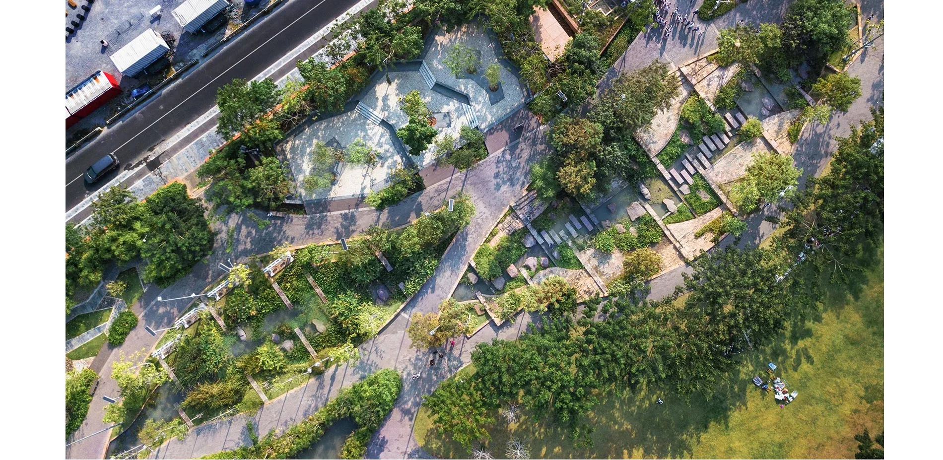 While playing a role in confronting climate risk, the park simultaneously serves as a recreational space and outdoor classroom for the university community, surrounding neighborhoods and urban dwellers. Adjacent to the main lawn are eight "landscape outdoor classrooms," each with different biomes and layouts,lining both sides of the park to serve as diverse multi-purpose areas. They include an herb garden, meditation area, reading room, bamboo garden, playgrounds, and earthen amphitheater. Whether in the choice of porous components or locally-sourced materials, these outdoor classrooms incorporate details to best complement the park's main ecological features.