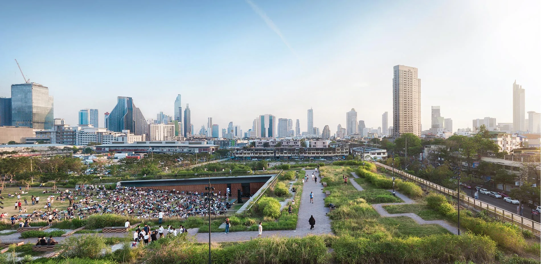 At the park's highest point, any member of the public can see Bangkok's skyline—not on an expensive rooftop bar or a skyscraper helipad, but atop the biggest green roof in Thailand covering 5,200 square meters where open skies and green grass are free to all. Laid with low-maintenance native grass and weeds which attract local birds and insects, the roof provides a unique experience of a rural and natural environment with a dense urban backdrop.