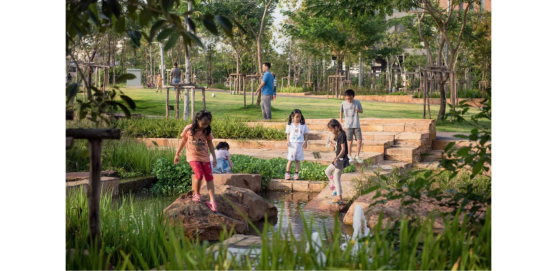 Excessive runoff from the green roof then flows down to four constructed wetlands, two on each side of the park. A series of cascading weirs and ponds slow the runoff and increase water aeration, aided by native water plants that filter and clean the water. In the concrete city of Bangkok, the park provides a hidden oasis where kids and adults can explore and interact with wetlands and hear the sound of flowing water.