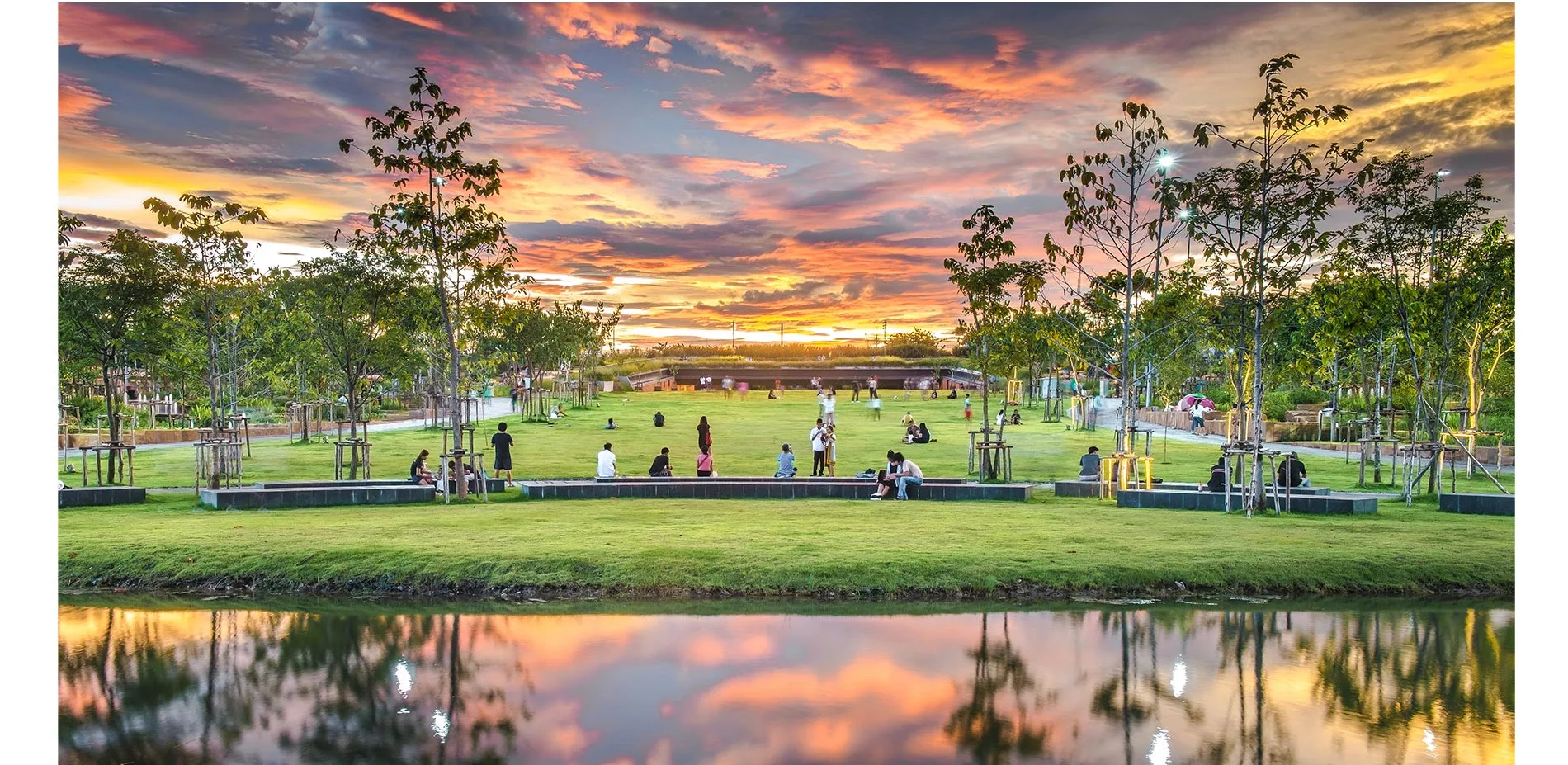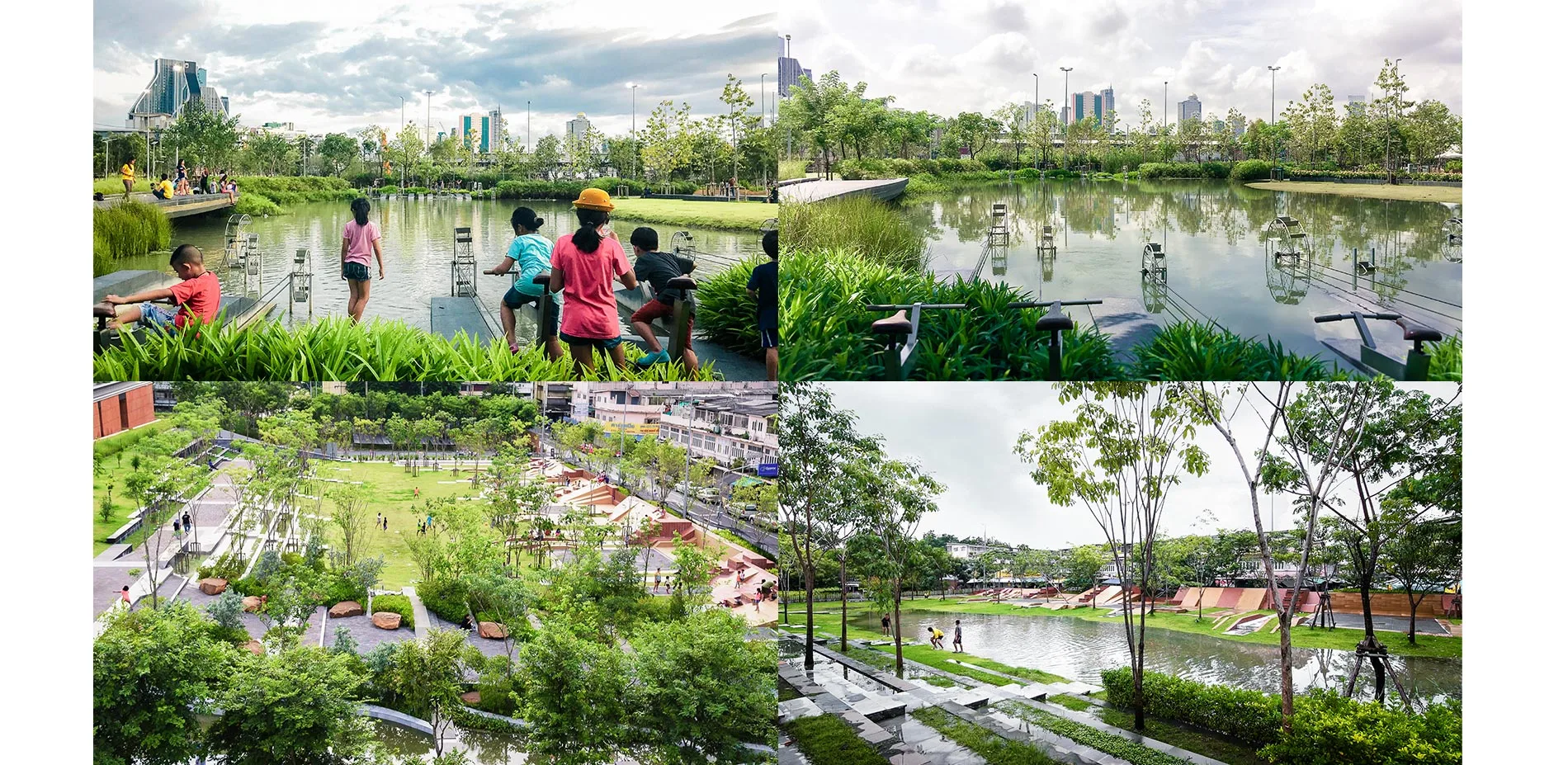 As Bangkok experiences droughts and monsoons, the park's water and landscape will continually grow and transform to unveil new environments for visitors to experience. Following the planting concept of establishing urban forests, 258 varieties of plants and trees have been grown either from seed or as young seedlings which easily adapt to climate changes, recreate a healthy ecosystem, and provide habitat for local birds, pollinators, and insects.