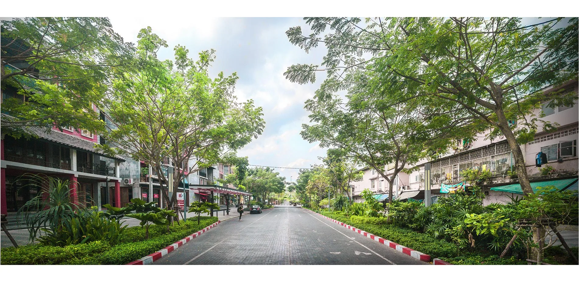 The first of its kind in Bangkok, the 1.3-kilometer road running perpendicular to the park was redesigned to shift priority from cars to pedestrians and cyclists. By reducing four vehicle lanes into two, providing space for people walking and biking, the once heavily-congested street now seamlessly connects pedestrians and cyclists directly to surrounding neighborhoods' residential, entertainment, and retail facilities. The park is lined with corridors of rain gardens on both sides to provide shade and human comfort, and reduce runoff from the adjacent road surface. This design is evidence to Bangkok the possibility of a commercially-developed area that is, finally, pedestrian-friendly.