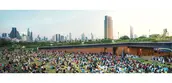 The main lawn at the park's center is a vast inclined open space for recreational activities. Unlike other flat parks around the city, this inclined park offers the unique experience of multi-purpose amphitheater for public events. On stormy days, the lawn absorbs rain and runoff, using gravity to send the water to the retention pond by the low end of the park. During severe flooding, this retention pond can store excessive water and double in size by expanding into the park's main lawn. Visitors, too, can become an active part of the park's water treatment system by hopping onto any stationary water bikes along the pond and using their exercise to keep the water aerated.