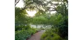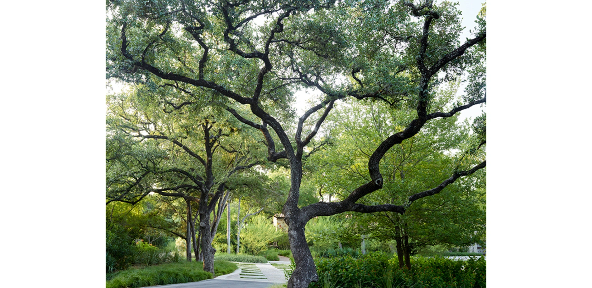 This stunning residential project draws inspiration from the oak savannas, prairies, and plains of Southeast Texas. Throughout the five acres of the site, a variety of experiences have been created to bring nature to the forefront. An elevated walkway leads through a canopy of large oaks; a pool and spa reflect the sky; green roofs help hide small structures; an entry set amid native grasses, sedges, and ferns welcomes visitors; paved areas softened with natural elements facilitate drainage; and a variety of outdoor living spaces serve as evocative garden rooms. Sustainable and subtle, this home offers an immersive escape where nature takes the lead.
