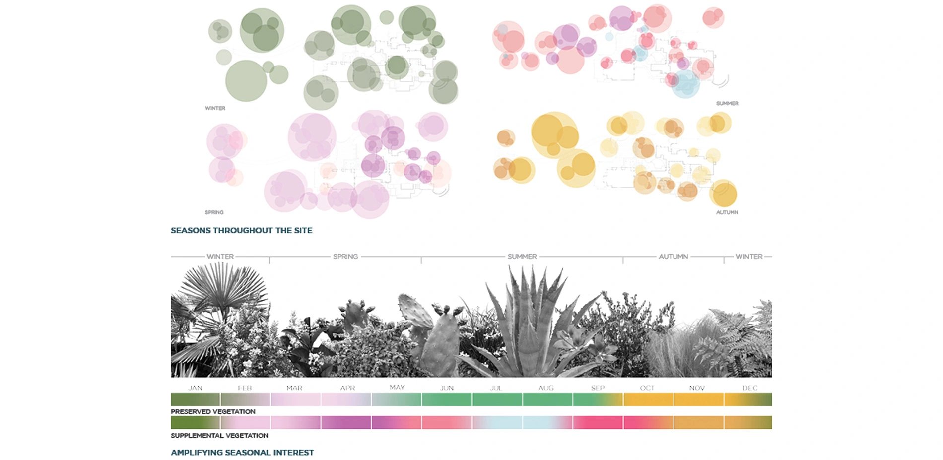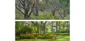 The Scrub Oak Savannah is home to many deer, rabbits, birds, and other wildlife. This area allows viewing without causing wildlife damage to the more fully developed garden rooms adjacent to the residence, with transparent fencing and plants securing the detailed garden rooms. An entry courtyard and canopy walk were developed around significant large oaks, facilitating accessible circulation to and around the residence and the garden rooms on the site's ridge at the rear. Tree canopies are viewed from within, further exaggerating and heightening the differences of this site's ecology and topography.
