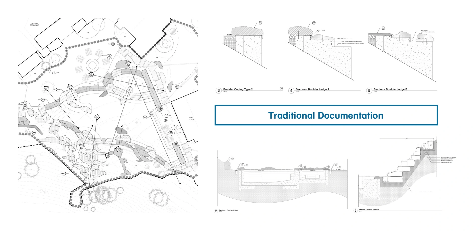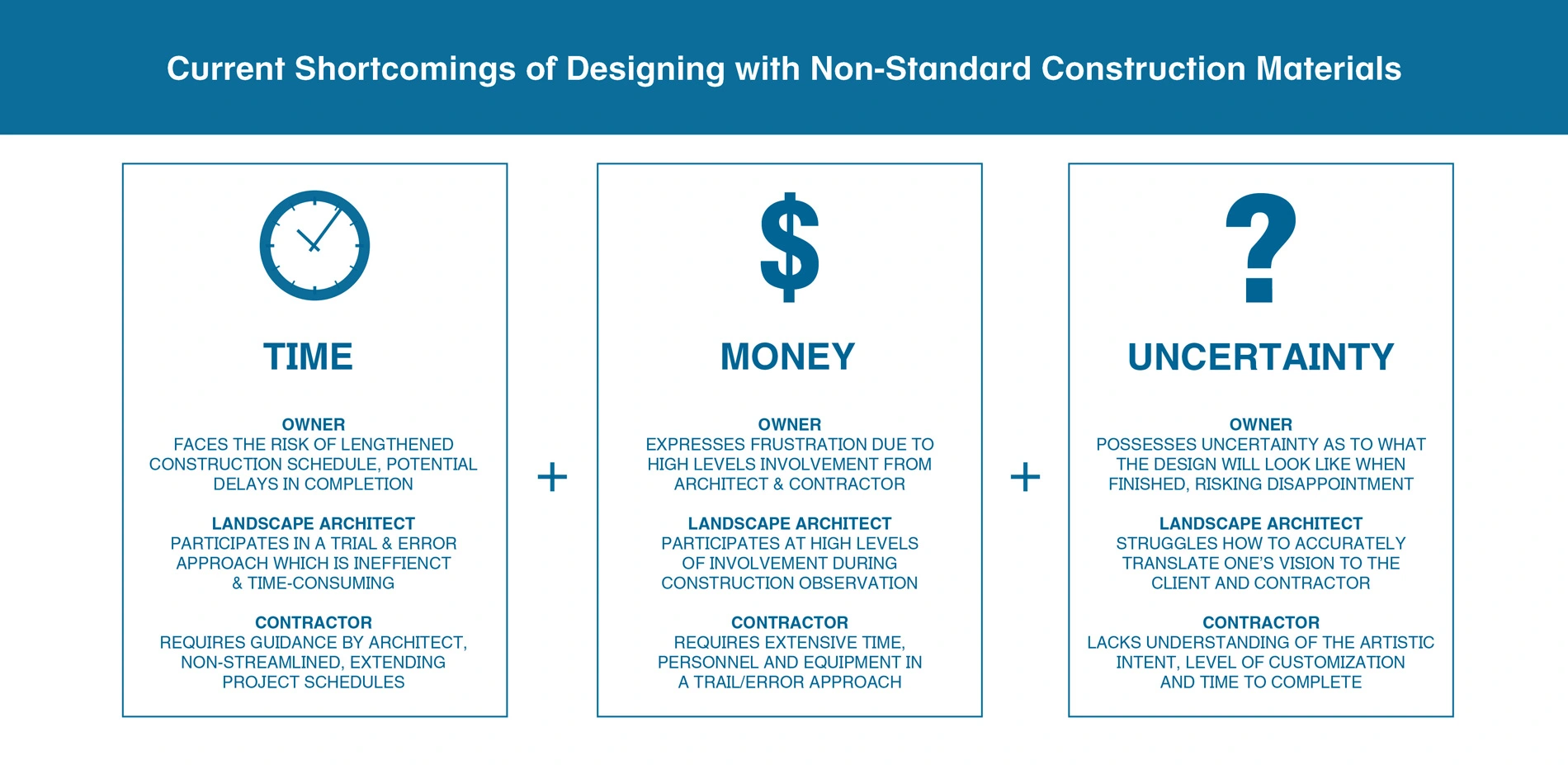 Construction documents and specifications are effective at communicating design intent for commonly used materials (i.e. manufactured products) but are limited in their ability to connect artful intent, constructability and sequencing when using non-standard construction materials (i.e. irregularly shaped landscape boulders). Landscape Architects designs with non-standard media on a regular basis; plant material, sculpture, earth-forms and water features to name a few. Implementation of non-standard media lends to the application of "artful interpretation" or "trial-and-error" decisions in the field; an inefficient process that is often time-consuming, costly and filled with uncertainty.
