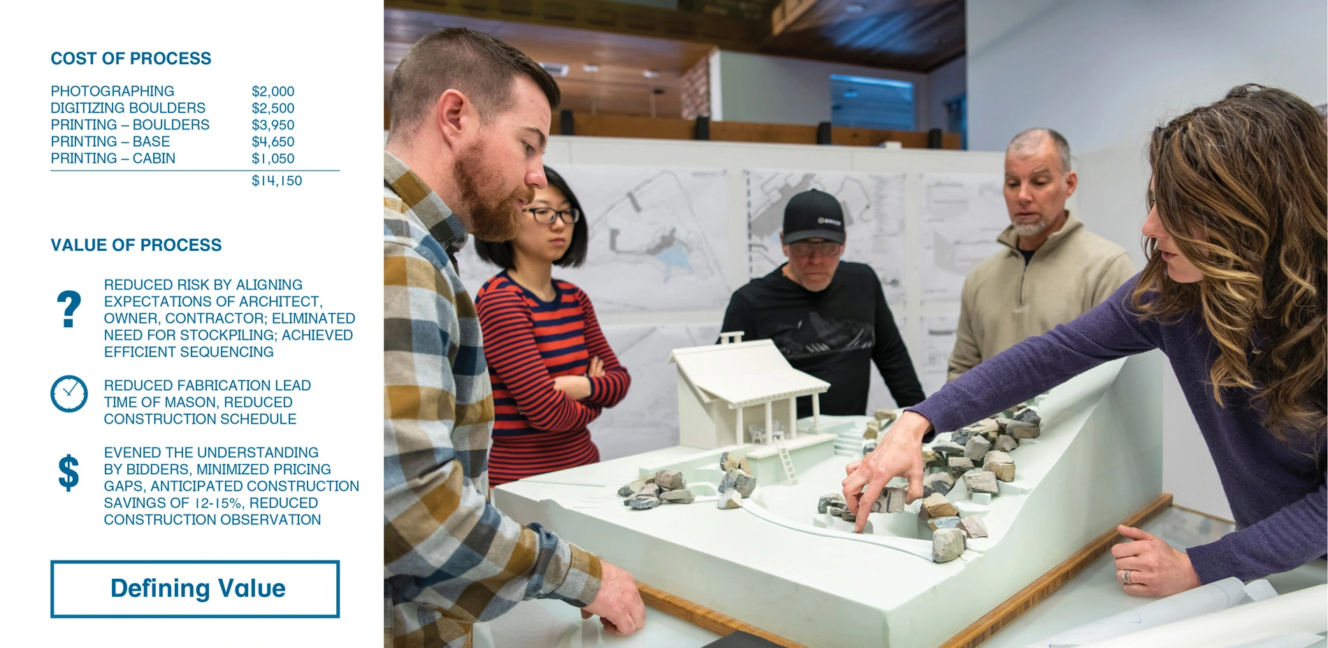 Prior to the boulder modeling, early construction estimates varied as much as 200% in subcontractor fabrication costs. Responses to RFI's to clarify the construction drawings only caused subcontractors to pad estimates further. As a result of OAC design sessions with the physical model, subcontractor bids leveled into comprehensive and accurate pricing proposals. The Landscape Architect was then able to refine the design approach to meet the client's budget goals, and a subcontractor was selected based on qualifications and thorough understanding of costs. Although additional costs were incurred at the beginning of the project, the 3D scanning and printing process allowed for more effective OAC risk management prior to the start of construction. Leaving subjectivity to the Landscape Architect can cause an Owner to feel unsure of the project and misunderstand the reality of the design vision, posing a risk to the Landscape Architect and client relationship. The boulder modeling was a rigorous tool for communication; improving client design participation, ensuring expectations could be closely managed throughout the design process and minimizing the risk of poor design results.