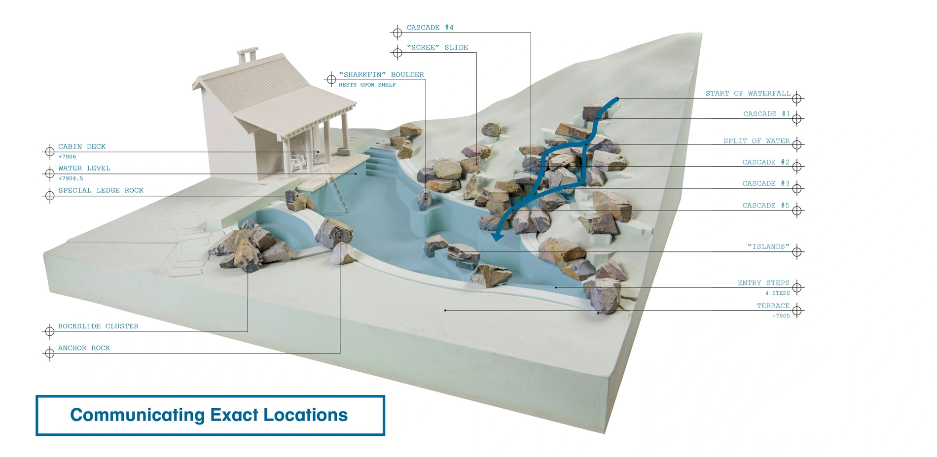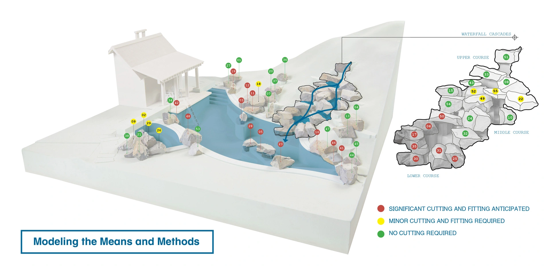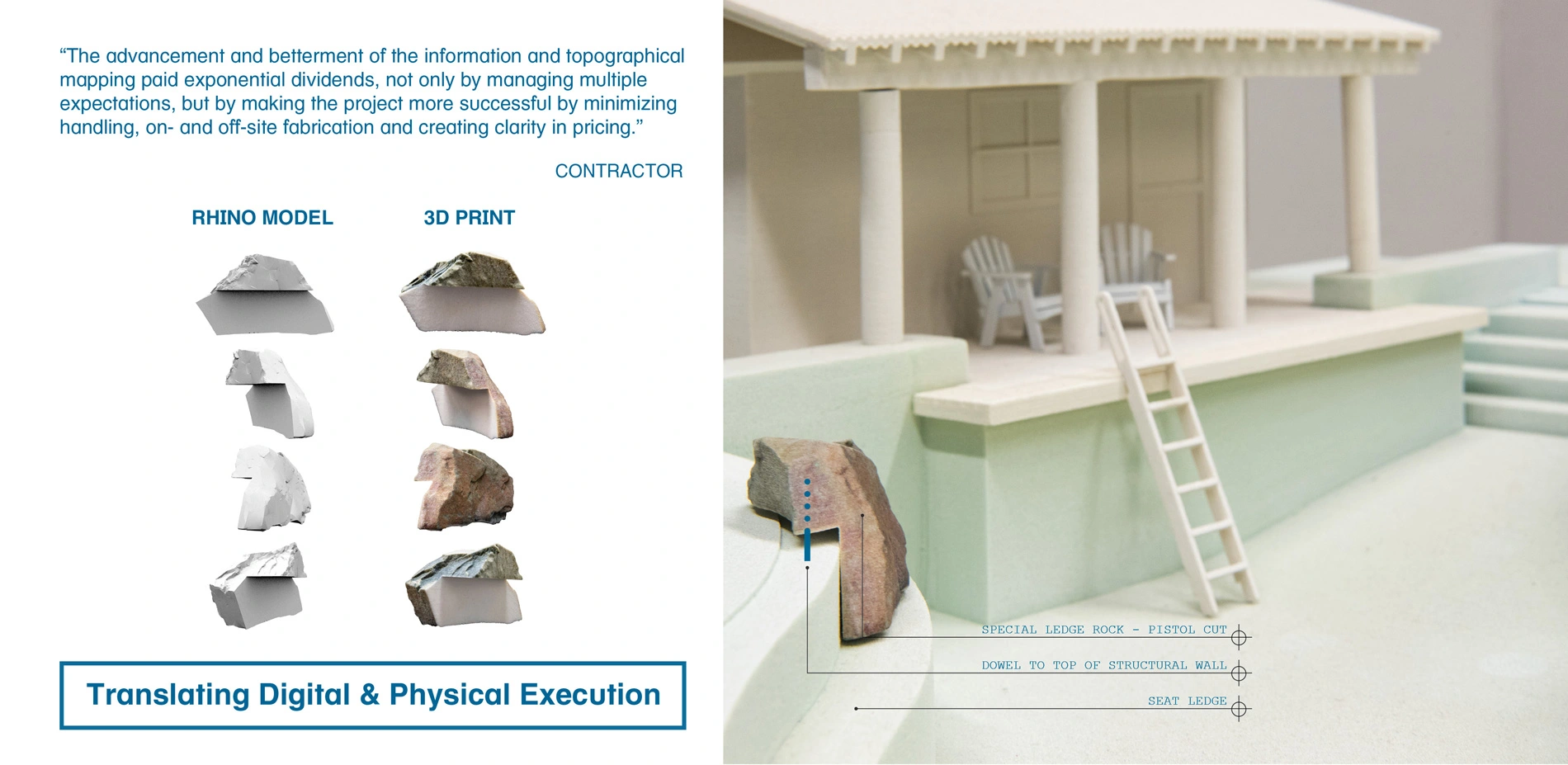 Through a deliberate use of technologies, the Landscape Architect instilled predictability into the design and construction process. To begin, the team developed a digital 3D model of the intended landscape water features. Structural walls and pool shotcrete thicknesses were accounted for to facilitate discussion of construction sequencing, boulder stabilization and owner understanding of design intent. This base model was then printed at 1"=10' scale. Next, the purchased landscape boulders were digitally scanned via photography. Several images were taken of each boulder from multiple angles. The boulders were tagged with an identification number to track them through the digitalization process and for later reference onsite during construction. A proprietary Auto-Desk program stitched together the boulder images to generate accurate 3D models printed with each boulder's unique shapes, natural clefts and granular texture. This allowed the design team to precisely place modeled boulders with intentional orientations on the base model. To improve communication of design details, the models were used in OAC meetings to glean design review and construction implementation feedback. After iterative rounds of design and constructability review, a final vision was documented for the site and construction documents were refined in response.