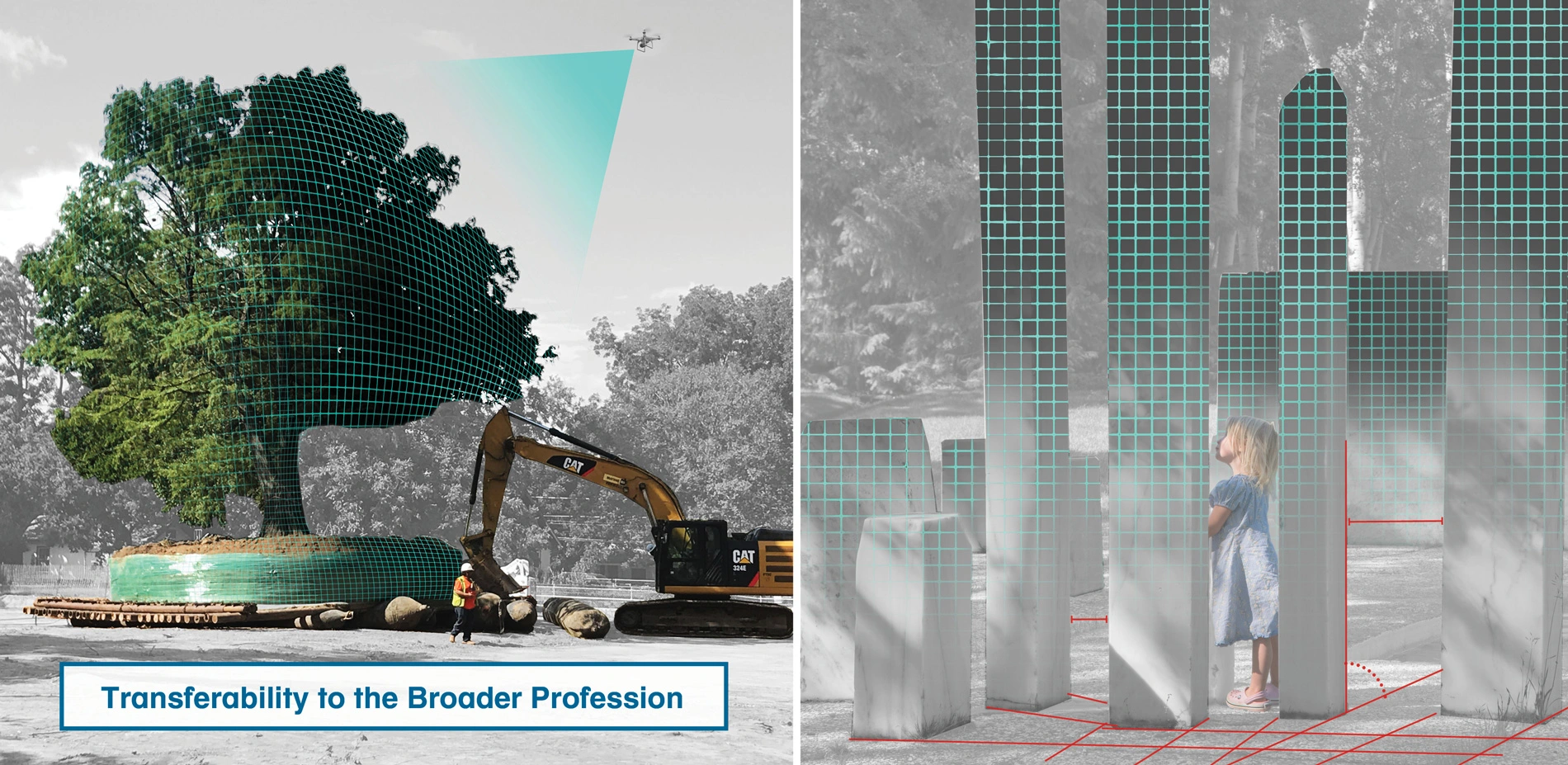 Beyond this example, the methodology represents a new way of communicating ideas, transferable to other non-standard construction materials within the industry of Landscape Architecture. The process may be applied to a broad range of project types and scales, including the documentation and restoration of historical preservation works, the installation of site-specific or large-scale art commissions, the transfer of design ideas during stakeholder engagement, as well as the testing of locations and arrangements of specimen trees, long before breaking ground. It can also communicate specific intent to contractors when the landscape architect is not local to a project's location, and/or not able to frequently visit the construction site. Collectively, the process improves the transfer of design ideas between the owner, architect and contractor and ensures alignment between design vision, client interests and construction realities.