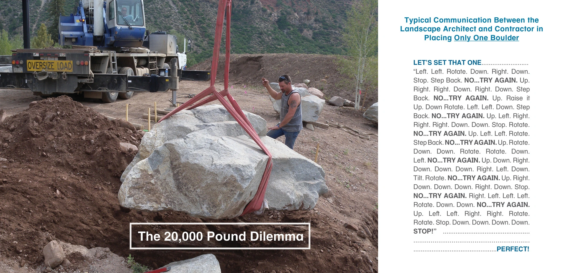 The typical approach to construction requires the Landscape Architect to be present onsite and observe/direct construction crews at every step of the process: boulder selection, placement, positioning and guidance regarding cutting or other fabrication. This trial-and-error method is time intensive, technically challenging and mistake-prone. In addition, waiting until site observation to fully understand the art of boulder crafting usually results in costly field changes, more sub-contractor time and delayed project completion. Most concerning, waiting to finalize the design vision until the middle of construction sequencing often results in - "it's too late for field adjustments" and "we can't achieve the desired design outcome".