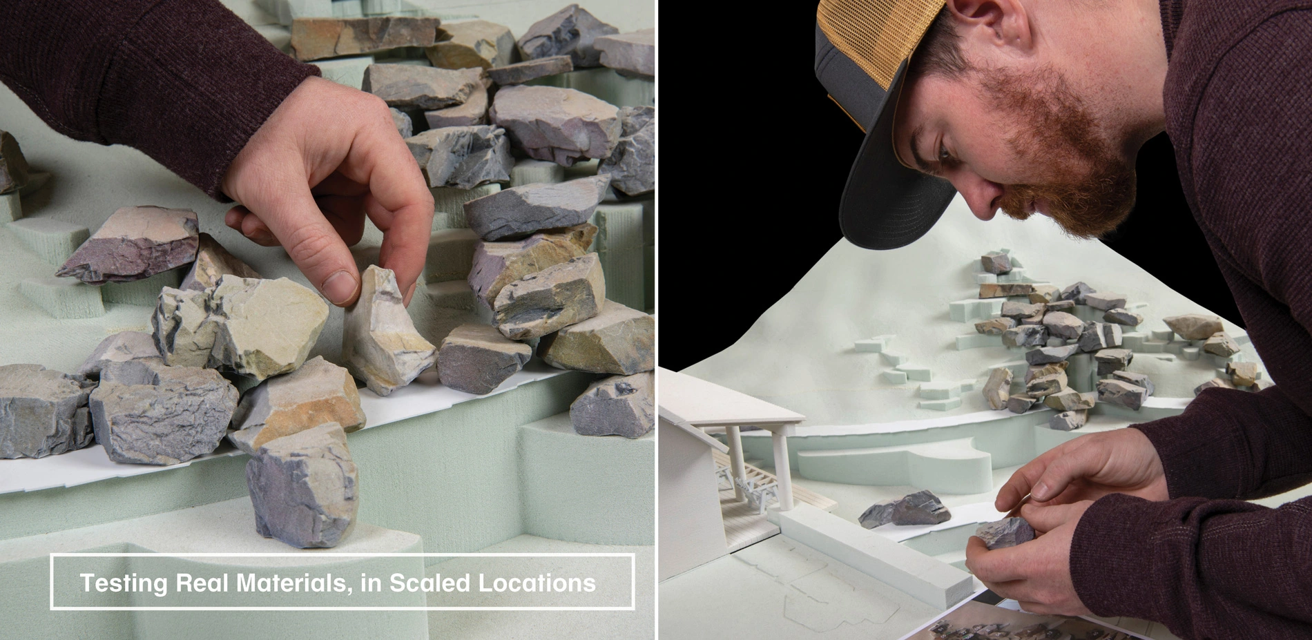 55 large boulders, each weighing between 1-3 tons, and 30 pallets of smaller slag material were obtained with the intent of integrating them seamlessly throughout the bodies of water as outcrops of rock and talus slopes resembling broken rock slides. The boulders would need to be placed in deliberate and subjective ways by the Landscape Architect to achieve the intended aesthetic; necessitating precise cutting, structural support and methodical construction sequencing. The selected boulders were jagged and irregular, and their sheer weight eliminated opportunities for experimentation. Capturing their individual character using conventional drawing methods did not communicate the level of craftsmanship, fitting and artistry that would be necessary during construction.