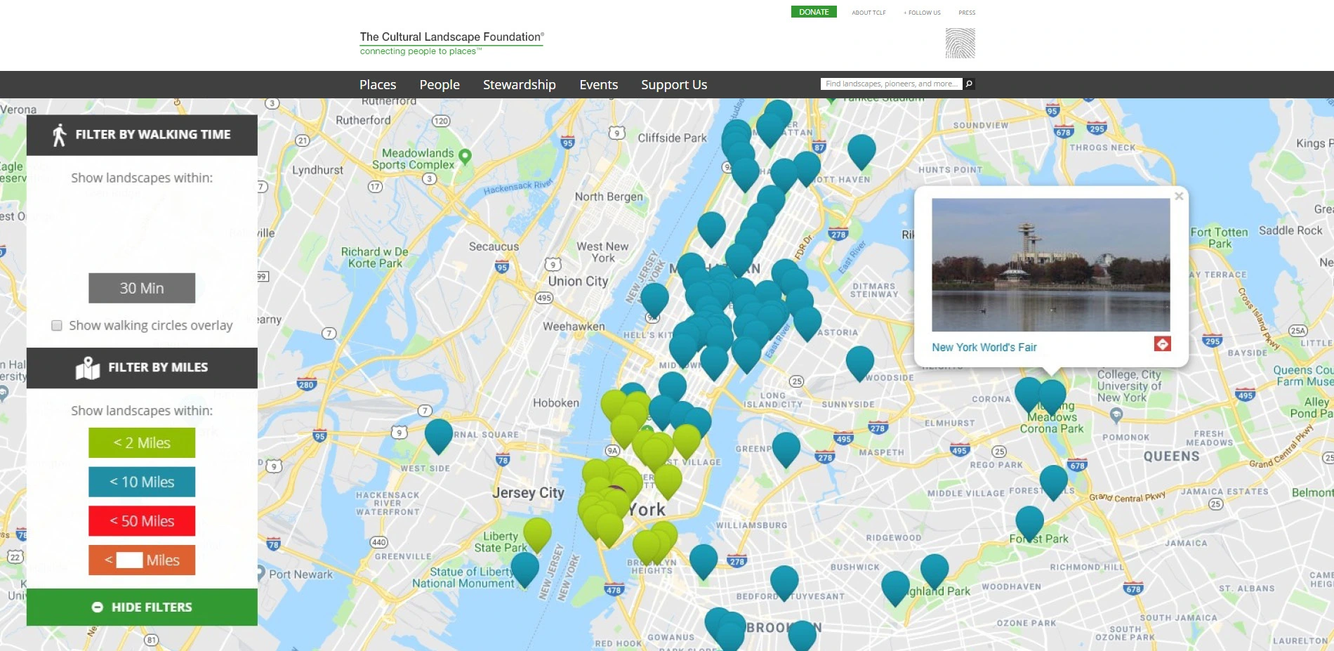 Each online guide includes essays (initially 50, but ever-growing in number) on sites and their designers, comprising a visually engaging, digital inventory of cultural landscapes searchable by type (e.g. Neighborhood Park, Scenic Reservation), style (e.g., Modernist, Picturesque), theme (e.g., Urban Renewal, Nature Conservation), and designation (e.g., National Historic Landmark, National Natural Landmark). TCLF and the NPS Northeast Regional Office have worked together closely to produce the guides, identifying, researching, documenting, and vetting a varied collection of landscapes in each subject city. Advised by NPS and TCLF staff, interns conducted field work and research in order to develop original documentary essays about the history, design, and current condition of the selected sites, as well as biographical essays about their designers. The essays (which are also fully integrated with and linked to the What's Out There database) are accompanied by contemporary photographs that illustrate the design character of the landscapes and the oeuvres of the designers. Moreover, the sites within each city are displayed on an interactive map and are linked to TCLF's recently updated What's Nearby feature, which allows users to see the landscapes within a customizable distance of their current location, with the sites presented in a color-coded display. Users can also filter the nearby landscapes according to walking time, in increments of 10, 20, or 30 minutes, roughly corresponding to distances of 0.5, 1, and 1.5 miles. This functionality is an essential enhancement to the guides, encouraging exploration of the urban environment on foot.