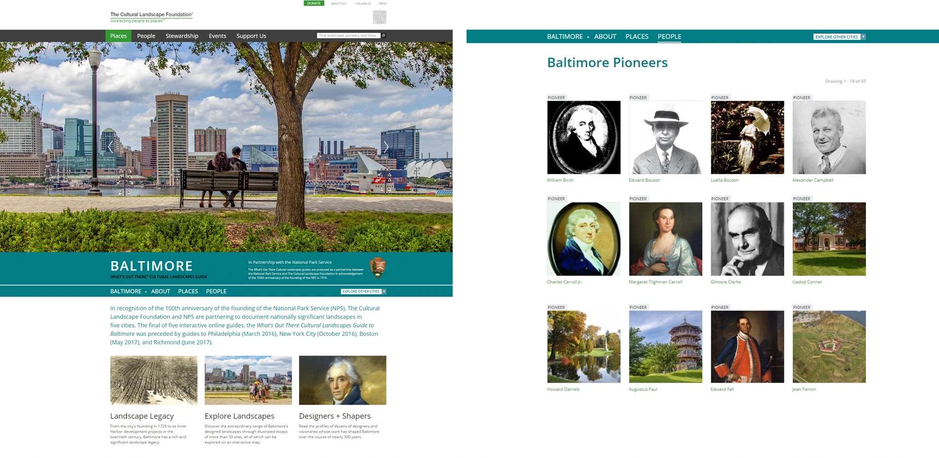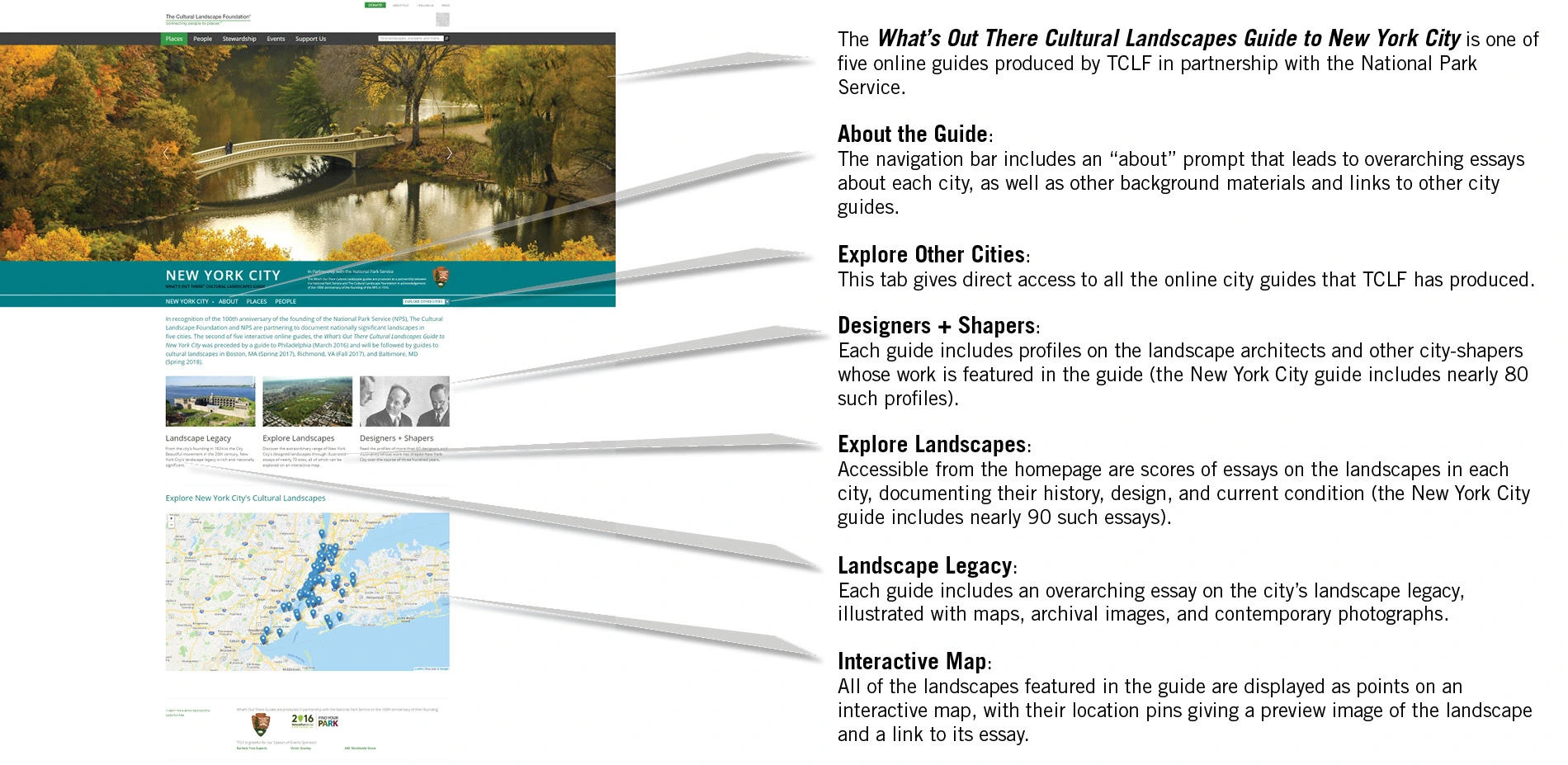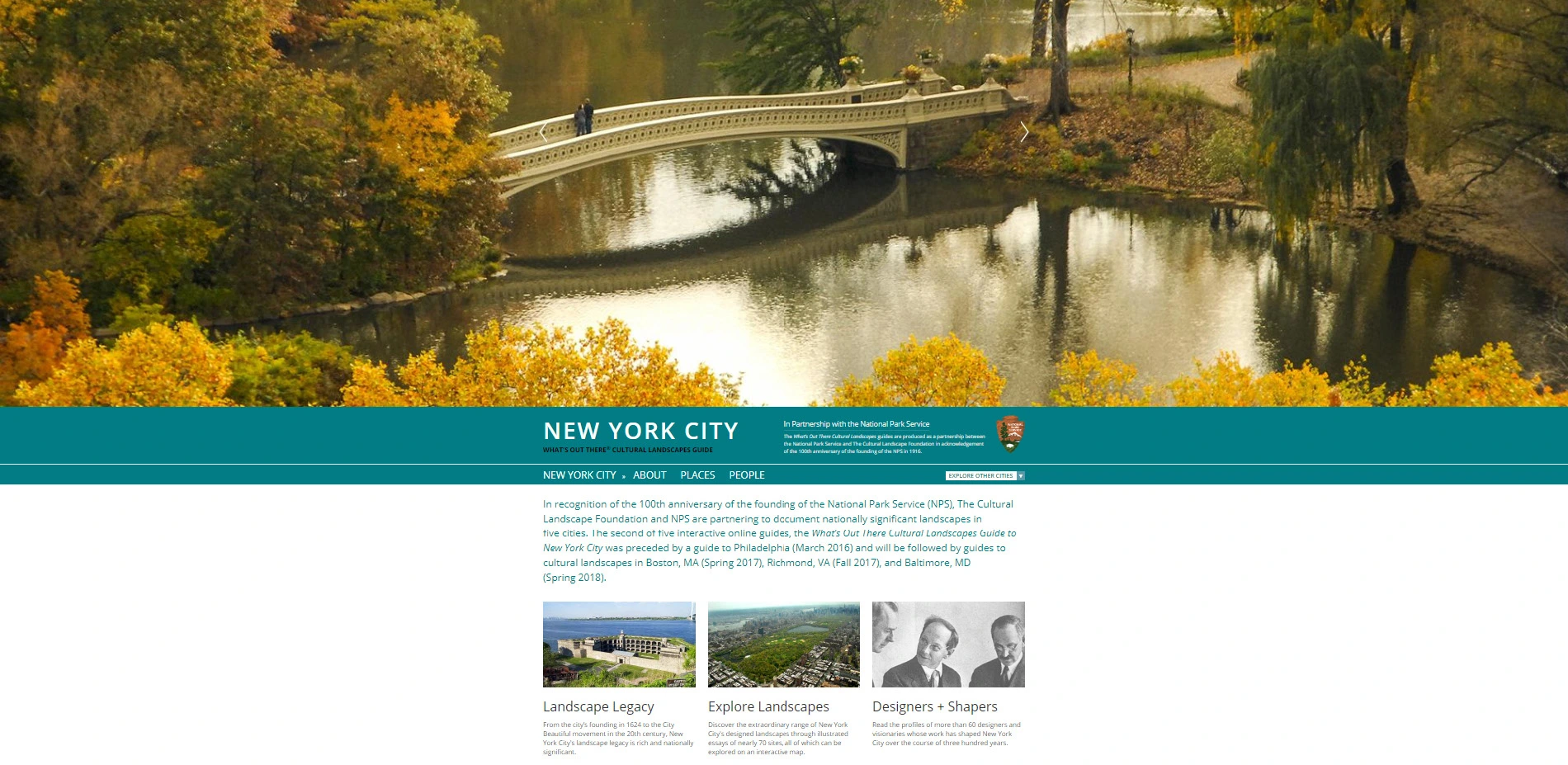 A direct outgrowth of the WOT database, the What's Out There Cultural Landscapes Guides present the landscape legacy of five of the nation's great cities. The online guides were produced by TCLF and the National Park Service (NPS) Northeast Regional Office to celebrate the NPS' 100th anniversary (the NPS was founded with the passage of the Organic Act of 1916). The partnership has produced guides to Philadelphia (March 2016), New York City (October 2016), Boston (May 2017), Richmond (June 2017), and Baltimore (February 2019).