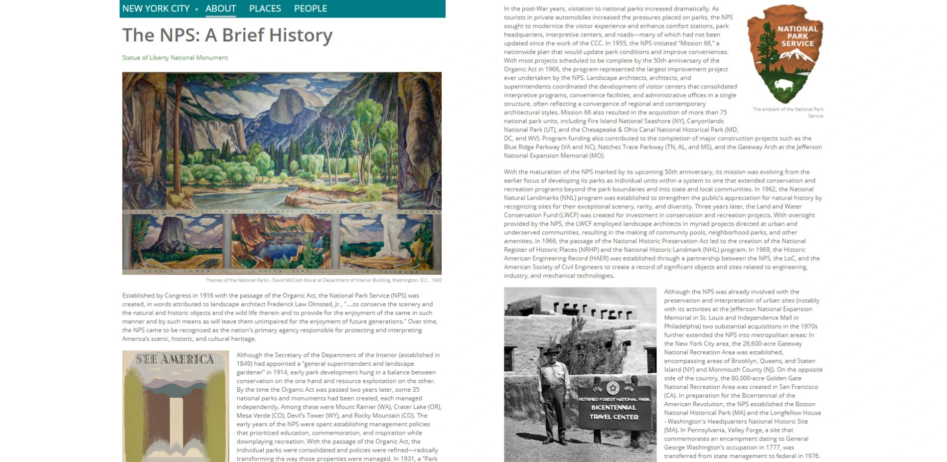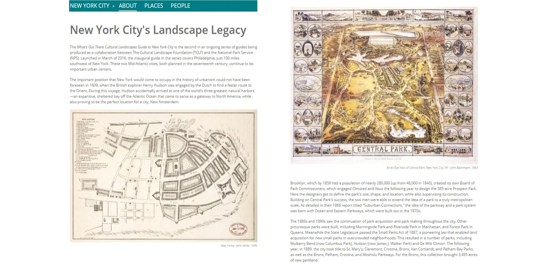 In addition to their interactive features, each guide also includes an overarching essay that spans multiple centuries and chronicles the city's cultural landscape legacy, richly illustrated with maps, archival images, and contemporary photographs. These introductory essays frame the history of the city from its earliest origins and chart its growth to the present. The guides also present a brief history of the NPS and identify several themes that communicate the breadth of cultural landscapes within its purview. The list of sites can then be sorted to reveal the landscapes associated with each theme (i.e., Nature Conservation, Lifeways and Cultural Associations, Transportation and Industry, City Shaping and Urban Planning, Urban Renewal, Patriotism, Historic Preservation, and Recreation). The sites can also be sorted according to several designations recognized by the NPS, such as their listing in the National Register of Historic Places, as a National Historic Landmark, or as a National Natural Landmark, etc. These designations and their importance are explained on a separate web page within each guide.
