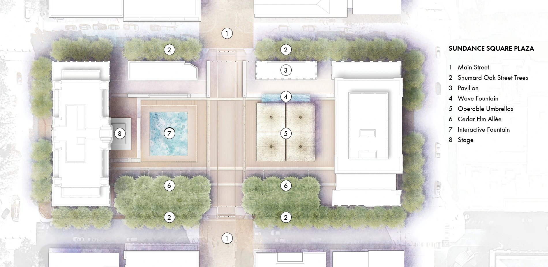 Sundance Square Plaza is the one acre "living room" of the city, a place where public life thrives. The site punctuates the half-mile, brick Main Street Corridor, which is anchored at its ends by the Federal Courthouse and the Fort Worth Convention Center. Seamlessly dovetailed into the historic fabric of Fort Worth, this development strengthens the identity of its community by offering a rich program of social interest.