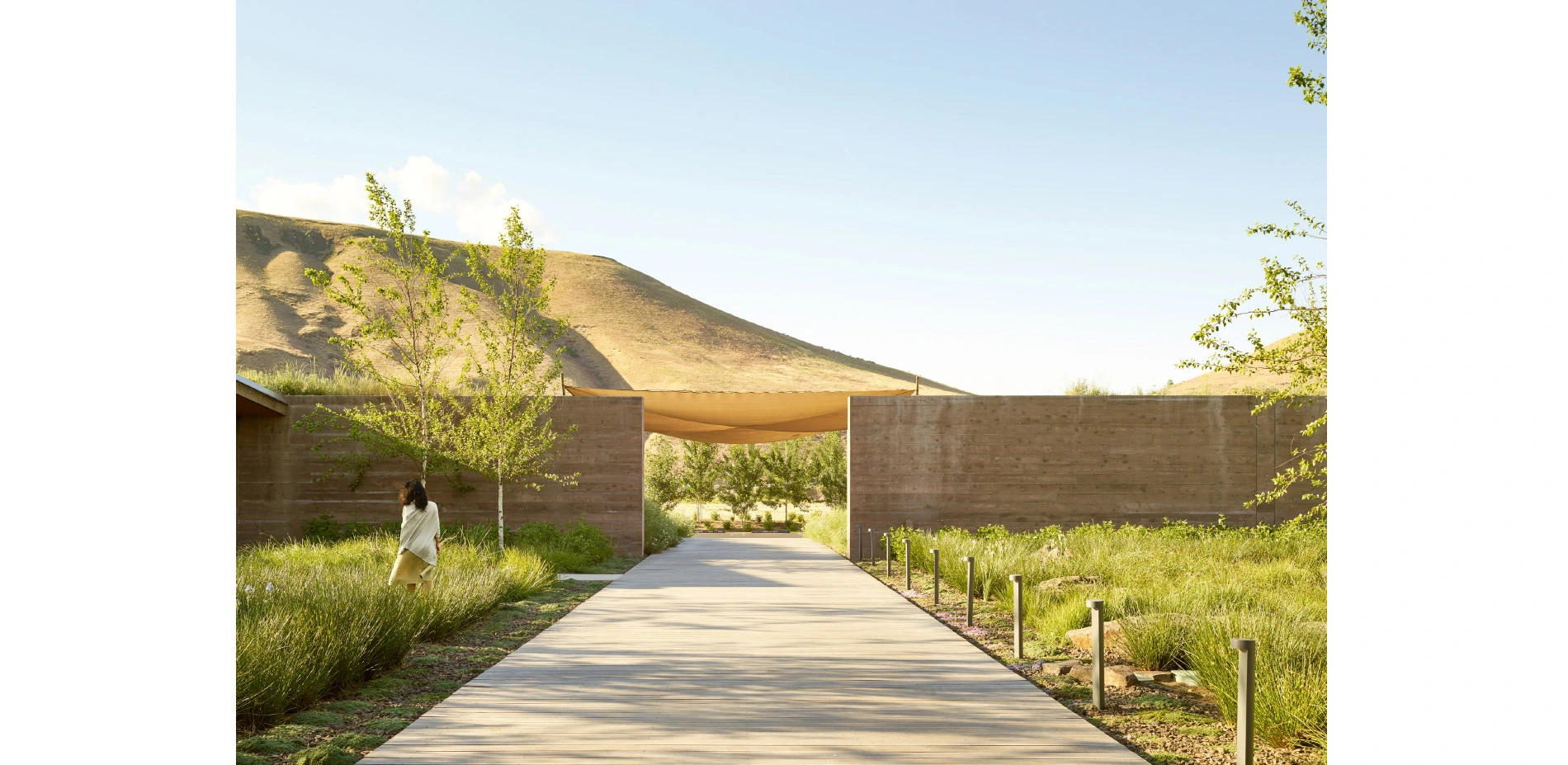 A wood-planked walkway, the main entry and exit point, bisects the courtyard and peels back the berm giving those leaving the site magnificent views of the distant hills and the gap through which the Yakima River passes. The entry walk is elevated slightly above the adjacent landscape giving the impression of a boardwalk, strengthening the riparian feel of the landscape. Floor to ceiling windows flood the interior with views, ensuring everyone visual access to nature and light.