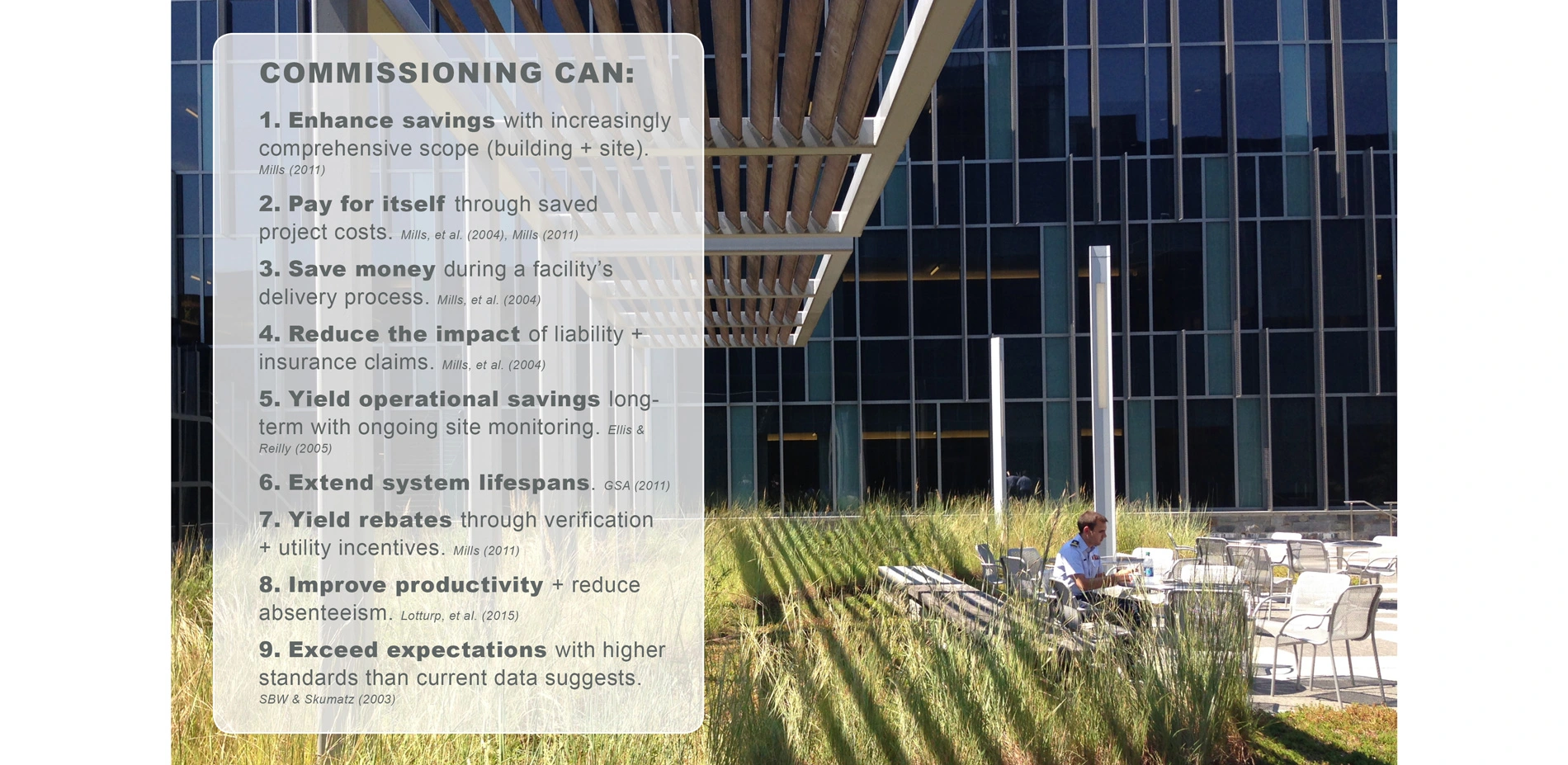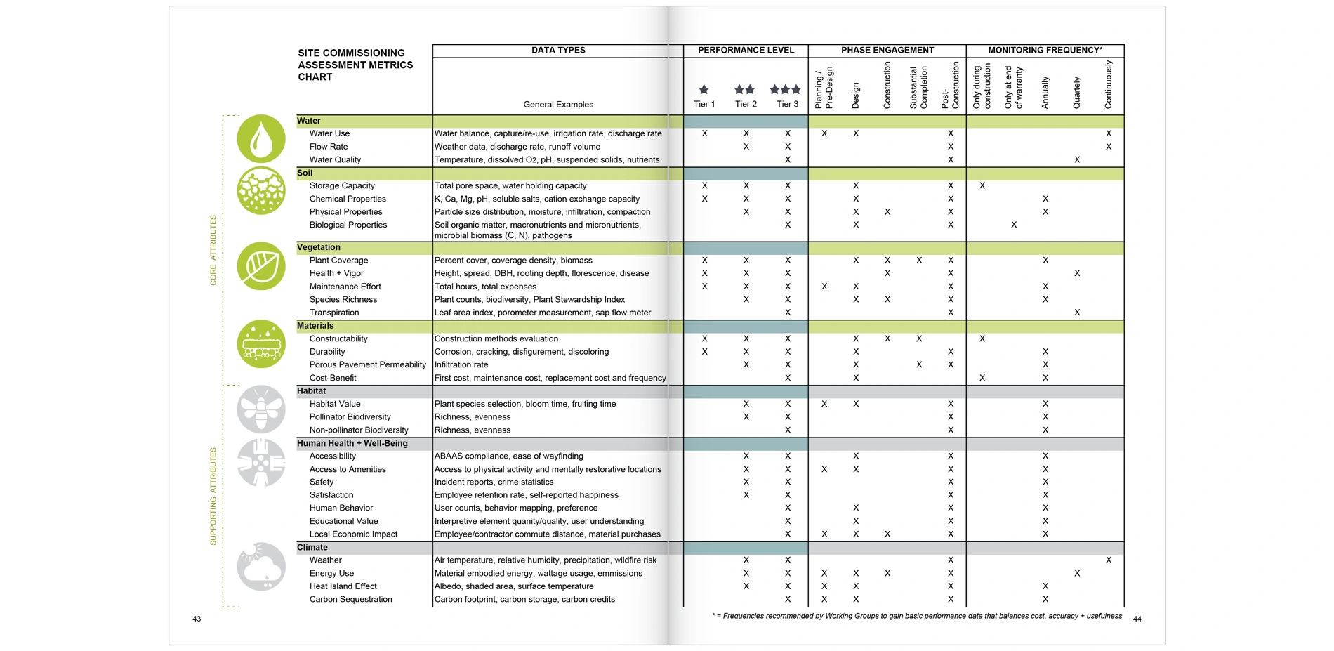 Site commissioning involves establishing landscape performance goals, designing and building to meet those goals, and then field-verifying that performance is maintained through time. Goals are tailored to meet the unique needs of each project, and can span the triple bottom line. For example, a port of entry in the arid southwest might establish a goal of sourcing 100% of irrigation water from air-conditioning condensate, whereas an office building in the densely-populated northeast might aim to decrease absenteeism by 2% over 5-years by providing views and access to green space (which research findings demonstrate improve workplace satisfaction and health, thereby decreasing absenteeism). Site commissioning serves to verify that relevant systems are designed, built, and operated to achieve these goals. By its nature, this process increases the accountability of a site’s design-construction-management team and elevates the chance that each constructed site will provide environmental, social, and financial services.