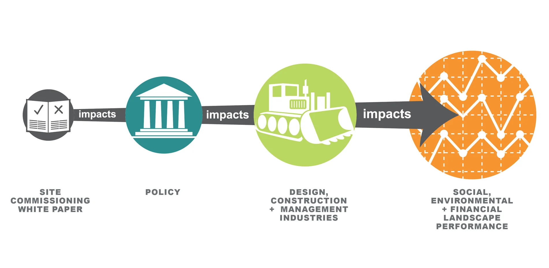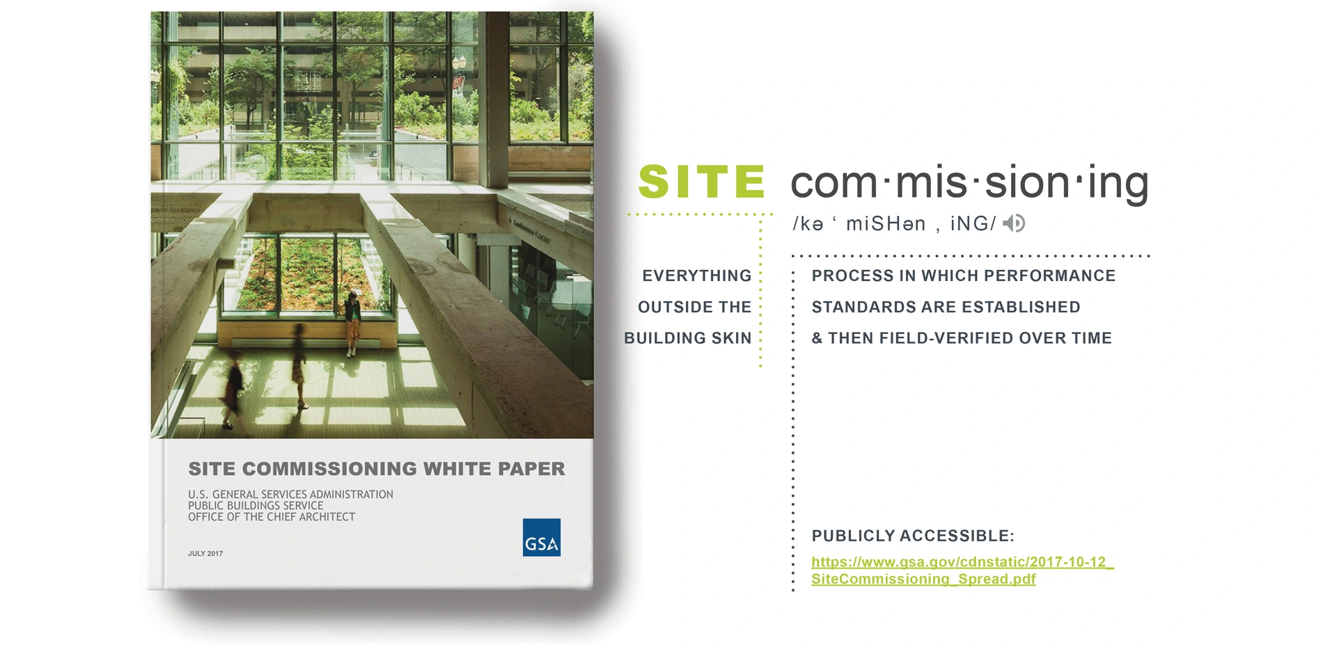 Site commissioning—the process of establishing and then field-verifying performance goals—is a mechanism for proving that investment in constructed landscapes is environmentally, socially, and financially worthwhile. The Site Commissioning White Paper, published in 2017 by the U.S. General Services Administration (GSA), proposes an agency-wide, site-commissioning process for GSA's future land development projects. This process has the potential to advance the effectiveness of the site design, construction, and management industries within one of the world's largest public real estate organizations, which in turn could positively impact landscape performance at a national scale. The white paper was developed through a unique collaboration between policy-makers, landscape architects, and 89 industry leaders. While written as a policy tool, the white paper's tone and graphic quality make it equally accessible to practitioners. The Site Commissioning White Paper uniquely demonstrates how landscape architects can help shape policy, thereby advocating for a more resilient built environment.