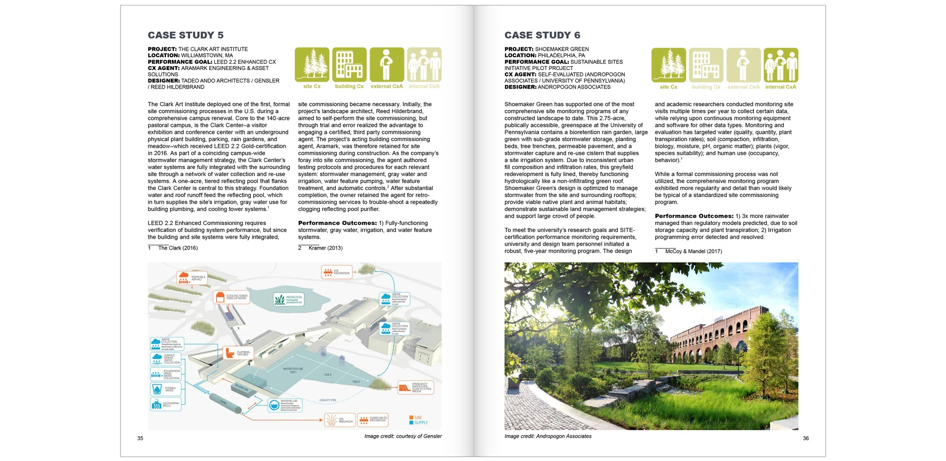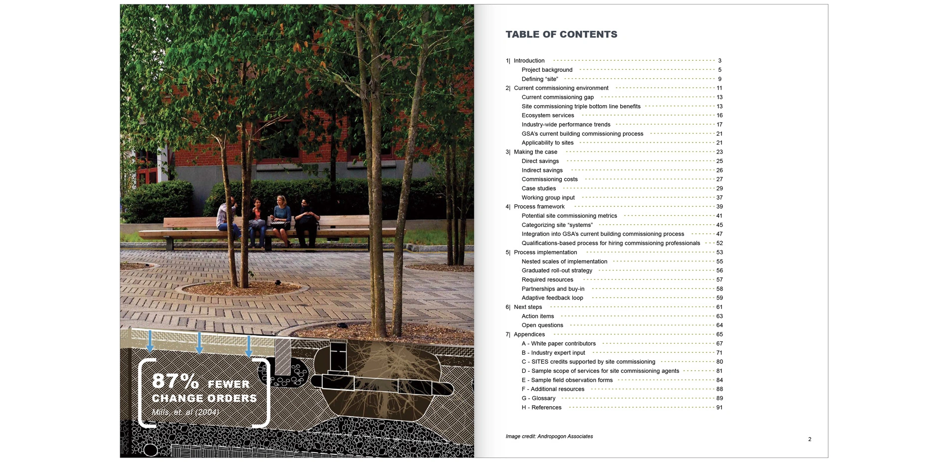 The Site Commissioning White Paper provides a data-driven, triple-bottom-line-benefits justification for verifying landscape performance in land development projects. Anyone who has sought facts to support their advocacy for verifying landscape performance will find it in this seminal publication, which remains the most comprehensive resource on the subject matter of site commissioning. Christian Gabriel attests that, “[the white paper] very thoughtfully aggregated and contextualized many disparate GSA policies and procedures and utilized those resources to justify all recommendations for pursuit of this policy vehicle.”