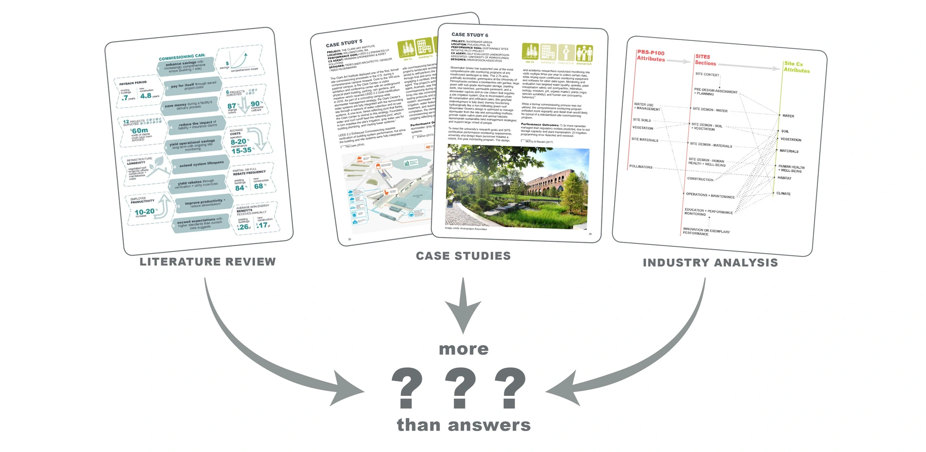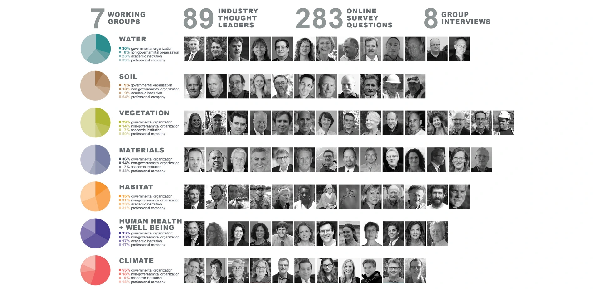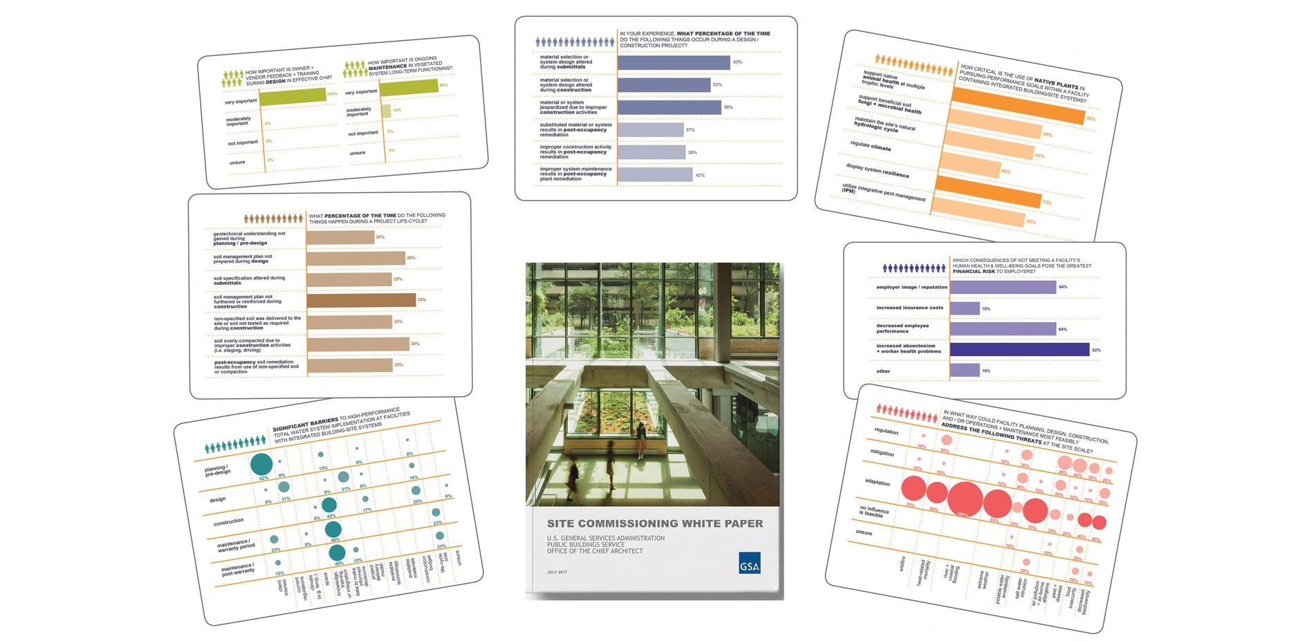 3) Case study analyses.Upon completing this initial investigation, insufficient evidence existed to assess site commissioning’s feasibility. The research team therefore engaged 141 industry thought leaders—representing governmental organizations, non-governmental organizations, academia, and the private sector—to join seven, subject-matter working groups: Water, Soil, Vegetation, Materials, Habitat, Human Health and Well-Being, and Climate. Eighty-nine participants (63% of those initially invited) joined the working groups, which each contained 11-15 cross-sector members. The research team then developed and administered an online survey specific to each working group, which was completed by all 89 members (100% participation). After analyzing the survey data, the research team conducted group interviews with each working group, totaling 58 participants (65% participation). The white paper’s resulting recommendations are directly informed by these experts’ critical insight, and further enhanced by the input of three commissioning advisors, three white paper reviewers, and a literature review-driven cost-benefit analysis. According to Christian Gabriel, PLA, ASLA—GSA’s National Design Director for Landscape Architecture—“the team conducted themselves to the highest standards from both an administrative and research perspective, producing an outstanding, world-class research report by any professional standard.”