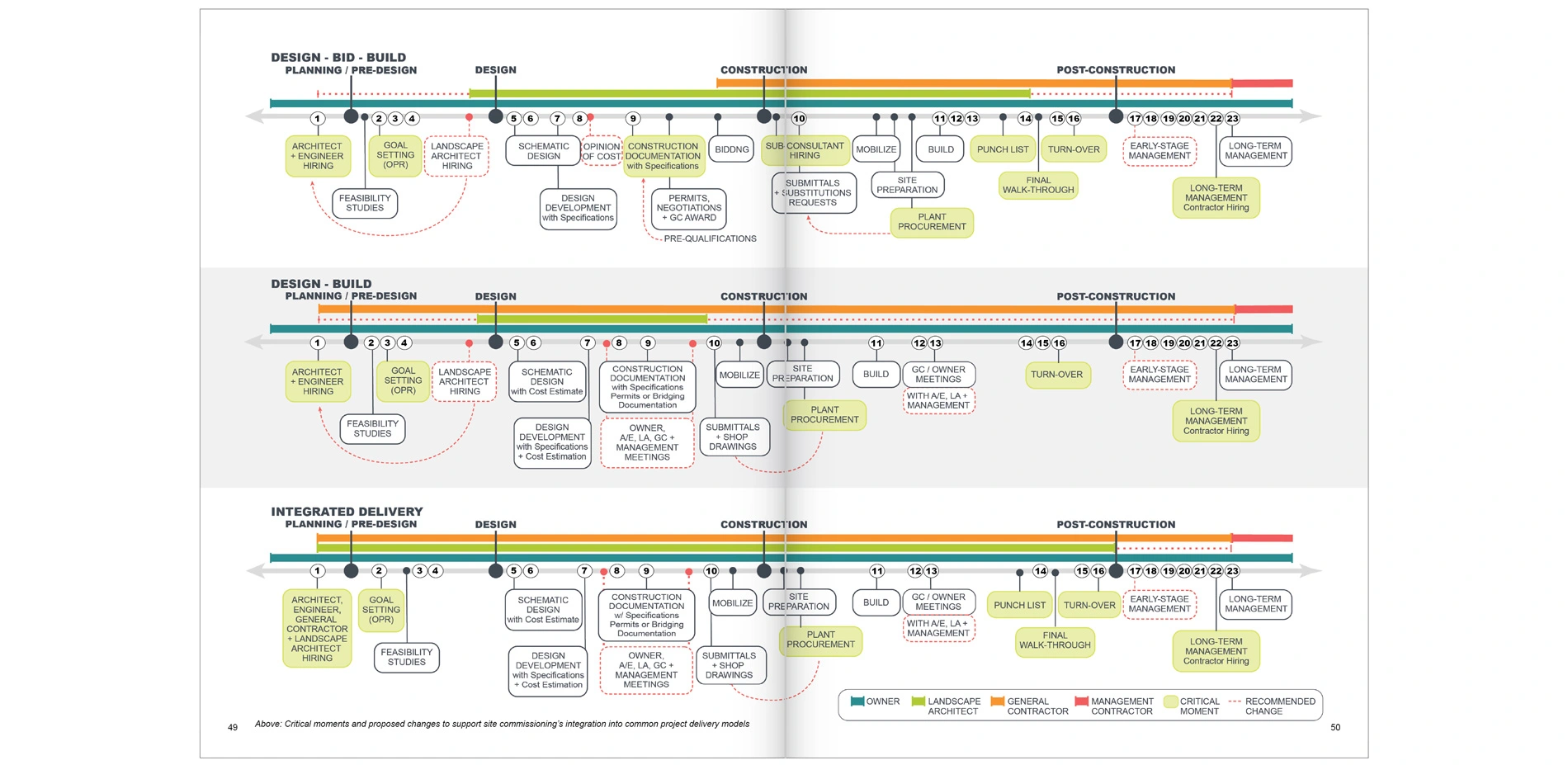 Implementing the white paper’s recommendations has the potential to positively impact not just one landscape, nor the GSA’s nearly 150,000 owned and leased acres, but all constructed landscapes. The breadth of this potential influence is unprecedented. GSA’s scale has historically steered markets—from design through product manufacturing—when adopting LEED, in 2012, and SITES, in 2016. GSA’s progressive adoption of a site commissioning process will undoubtedly shift the design, construction, and management markets further as the industries and owners realize site commissioning’s triple bottom line benefits for their own projects. These shifts could result in growth for the landscape design and management industries, which were valued by IBIS World in 2017 at $5 billion and $83 billion per year, respectively.