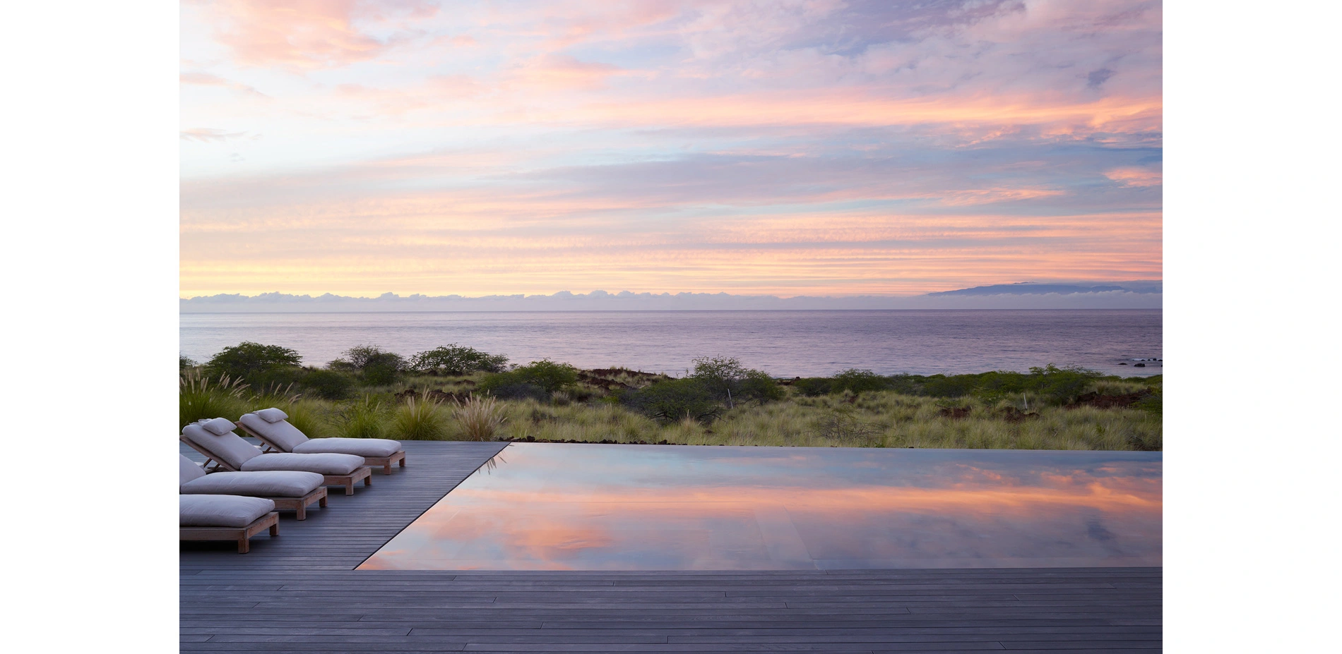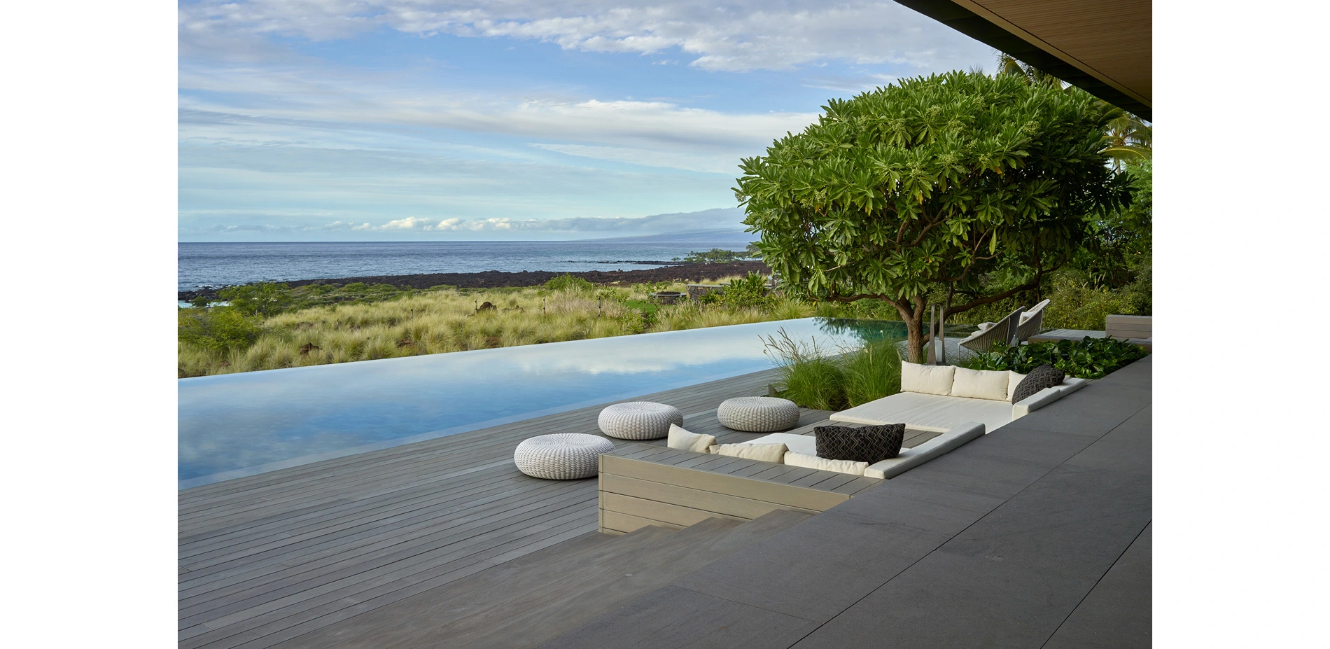 This single family residence on Hawaii’s dry, volcanic Kona shore draws on the elemental forces that shaped the land to contextualize its material design and embed human aesthetic experience within the landscape. The site is on a transect from a mountain top to the ocean, two extremes of the Hawaiian landscape. The design team collaborated to develop a series of indoor-outdoor living spaces that trace the narrative from mountain to ocean, taking cues from Hawaii’s geological and cultural history. The material choices serenely distill the unique colors and textures of the surrounding landscape. Beginning on the mountain side of the site, a sequence of spaces emerges from a cleft in lava bedrock, proceeds through a freshwater oasis-like interior courtyard, finally opening out to an expansive view of the ocean. The visitor’s journey terminates at the pool deck where the pool emulates and seemingly merges with the vast ocean beyond.
