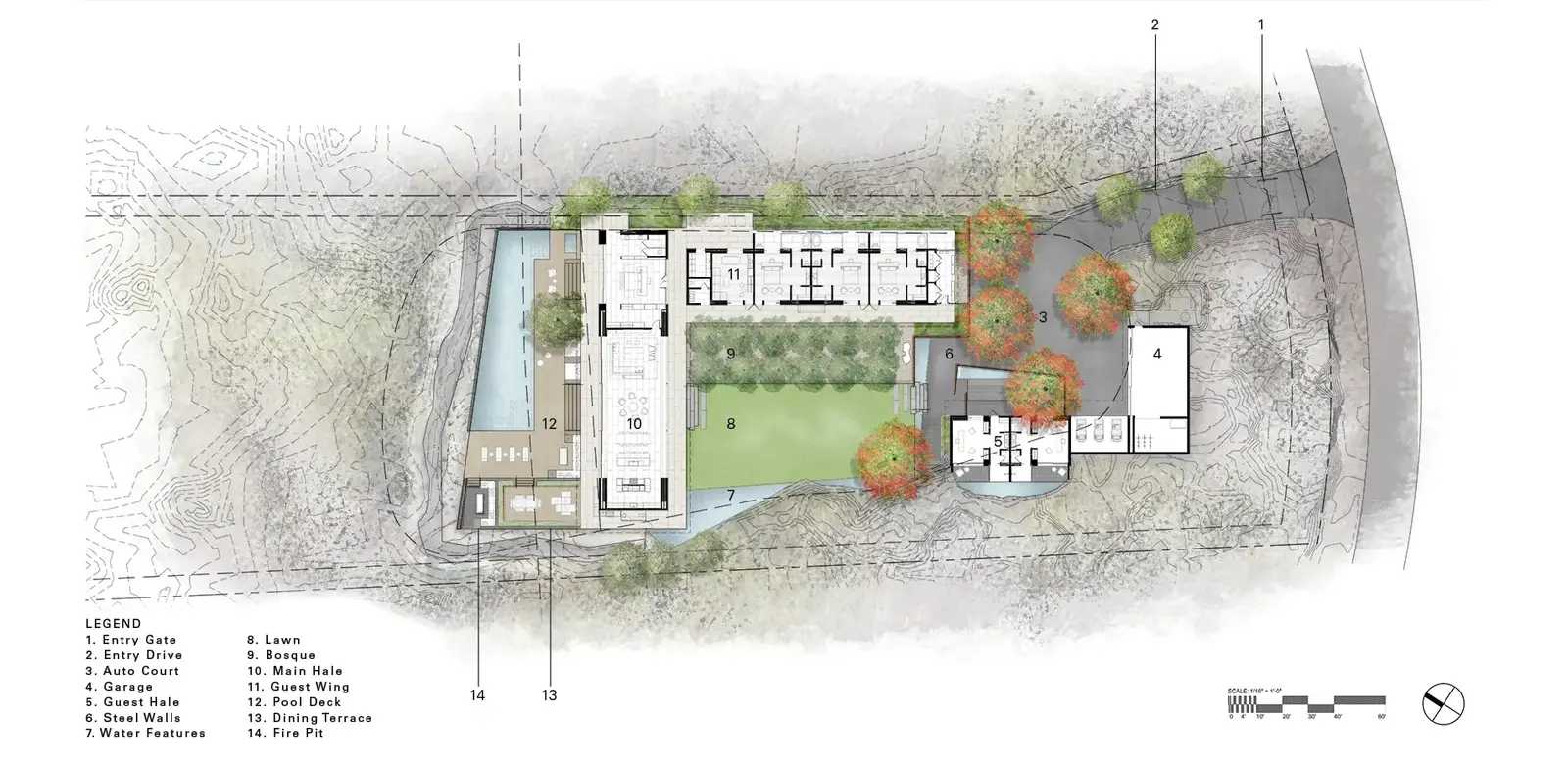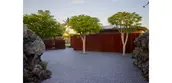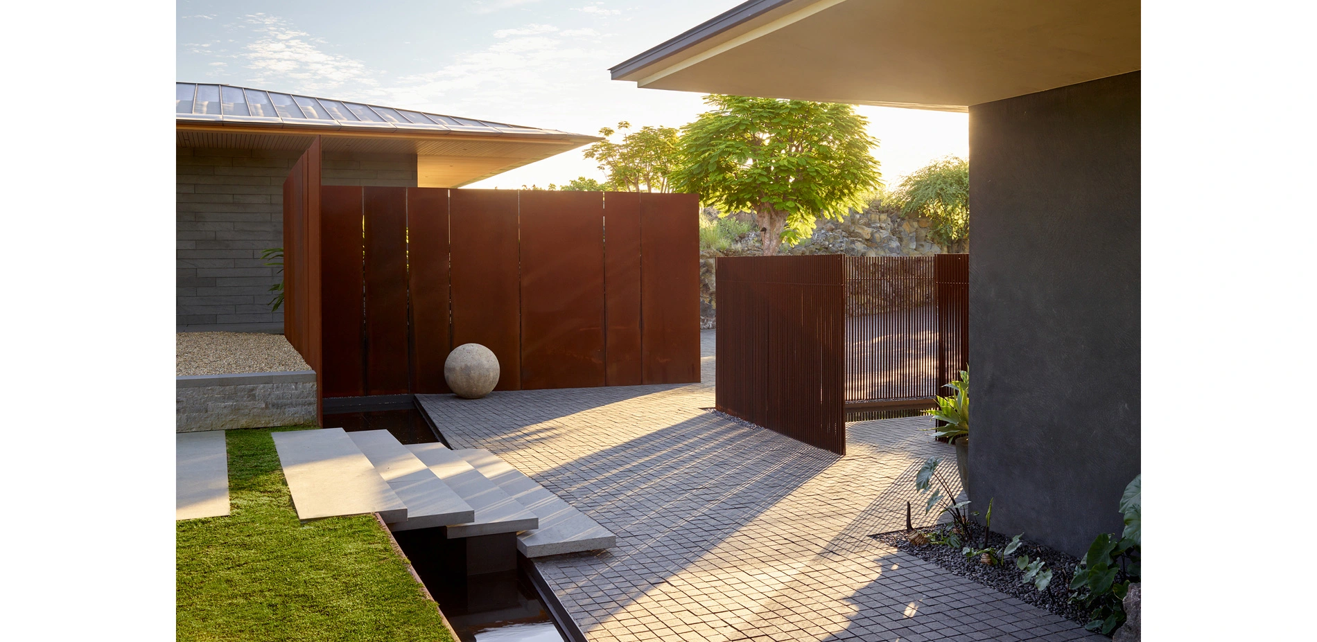 The site journey begins in a mountain landscape. The driveway cuts an arcing channel through ten feet of raw lava rock on either side. Black basalt cobbles flow from wall to wall, filling the edges of the excavation like a lava flow. The contemporary, refined paving material is at home in the rocky landscape while contrasting with the rough landforms. Pennisetum grasses and wispy Kiawe trees pull in the color and texture of the raw surrounding landscape. The arrival court intensifies the refined interpretation of the wild lava landscape. Flame trees puncture the basalt paving. Weathered steel panels and rows of steel rods enclose the space and screen the interior courtyard from view.