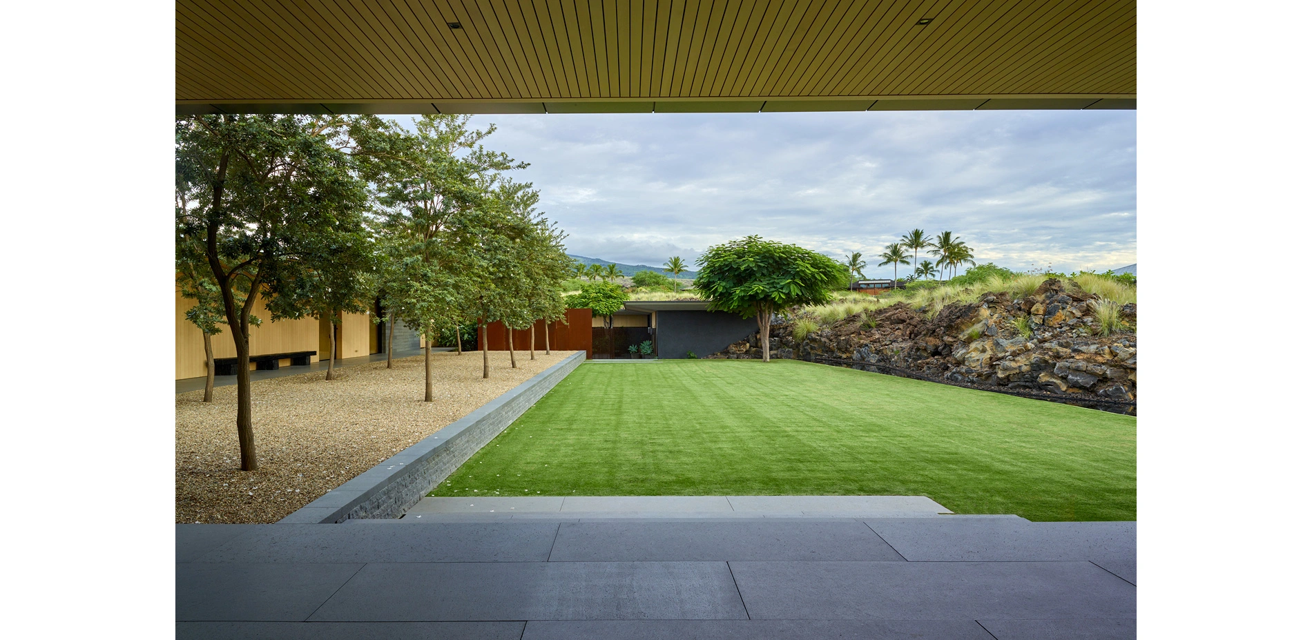 Beyond the autocourt, a series of reflecting pools offers respite from the harsh landscape, drawing visitors into an oasis-like space. This central courtyard, encompassing the living spaces, is built from the concept of an anchialine pond, where freshwater gathers in lava rock. The arid landscape falls away and the stone underfoot gives way to a springy lawn. To one side, reflecting pools enhance the sculptural characteristics of the natural lava as they emerge from the rock walls and spill into the courtyard. Two rows of tabebuia trees flank the other side of the lawn, echoing the airy refinement of the hale, or house.