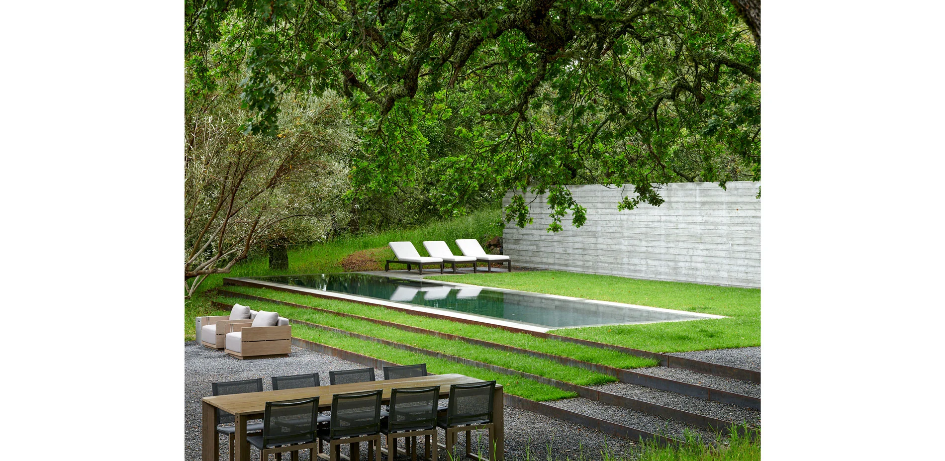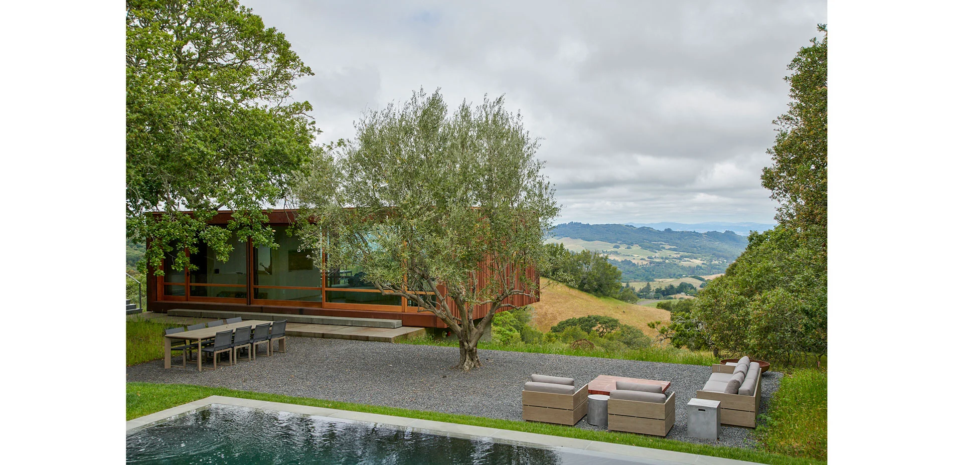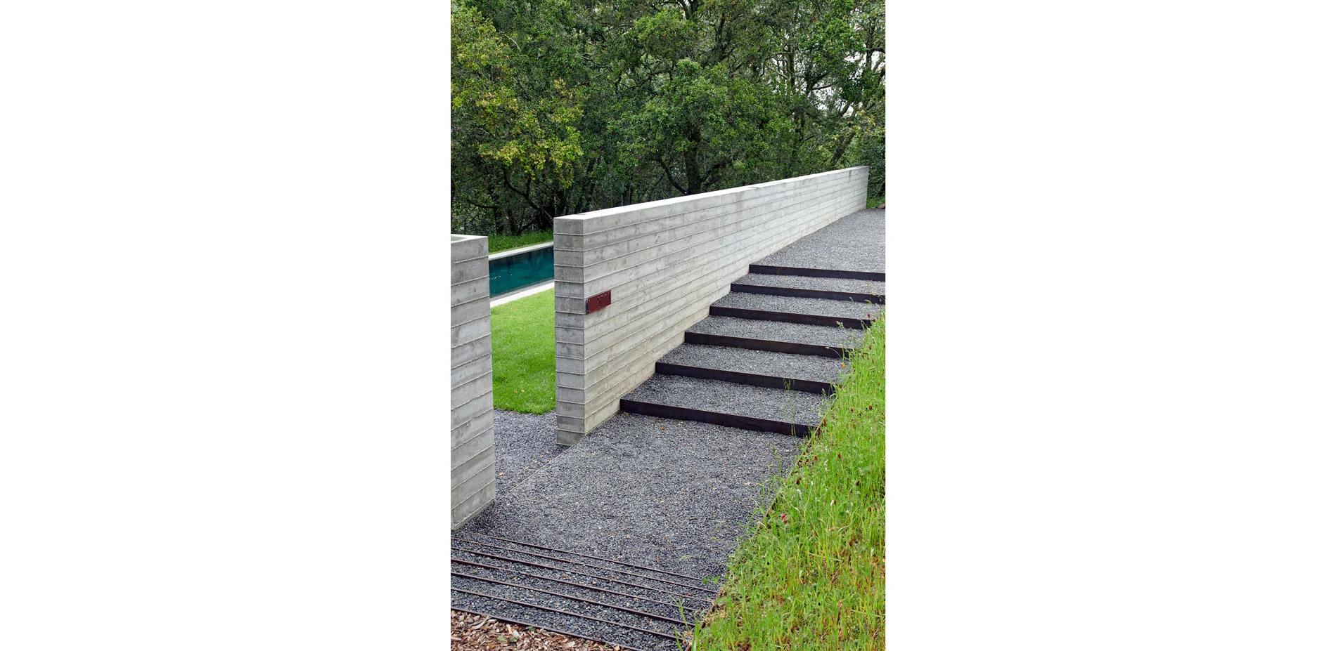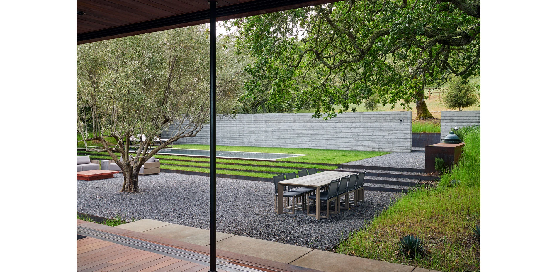 Hardscape materials comprised of natural stone, weathered steel, and board-formed concrete gently impose on the naturally beautiful and ecologically conserved site. The precisely crafted board-formed concrete wall that separates journey from relaxation, vehicle from pedestrian, holds a wide portal to the heart of the project, a courtyard that includes an outdoor kitchen, pool, aggregate-paved seating areas, and a terraced lawn. Each material change in this zone is crisply executed such that soft, hard, textured or liquid surfaces lend maximum contrast to the overall aesthetic of the space, calming the senses with restraint. To relax the orthogonal nature of the space, a lone, aged olive tree resides in the lawn as sculpture on a plinth. Along the edges of the space, oaks and grasses envelope and transition the designed intervention back into nature.