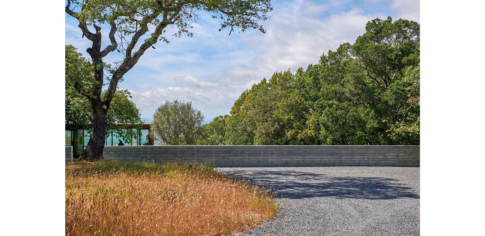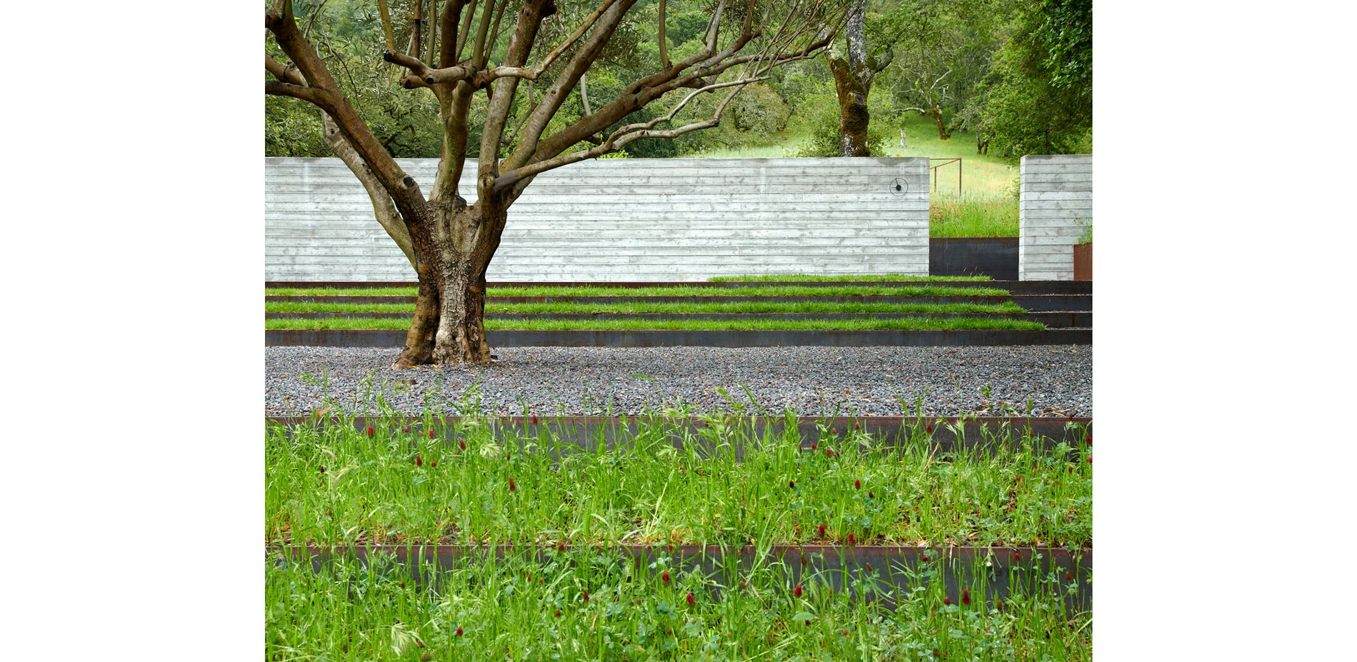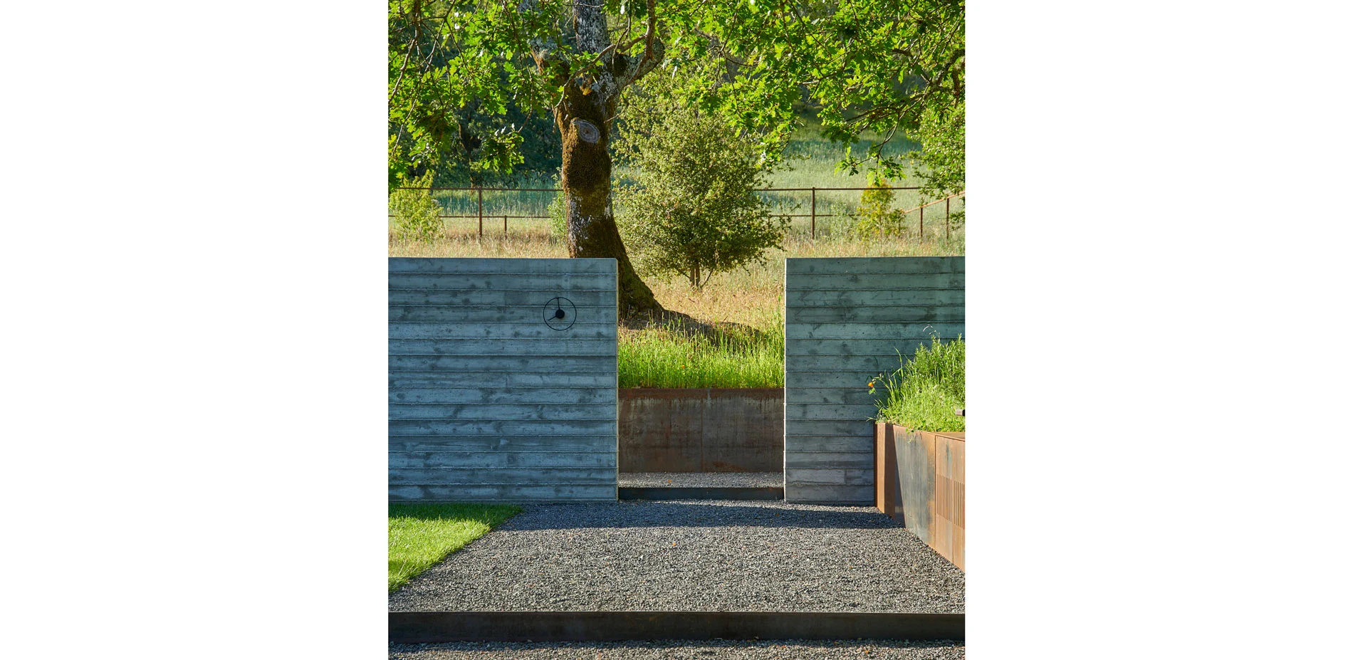 Hardscape materials comprised of natural stone, weathered steel, and board-formed concrete gently impose on the naturally beautiful and ecologically conserved site. The precisely crafted board-formed concrete wall that separates journey from relaxation, vehicle from pedestrian, holds a wide portal to the heart of the project, a courtyard that includes an outdoor kitchen, pool, aggregate-paved seating areas, and a terraced lawn. Each material change in this zone is crisply executed such that soft, hard, textured or liquid surfaces lend maximum contrast to the overall aesthetic of the space, calming the senses with restraint. To relax the orthogonal nature of the space, a lone, aged olive tree resides in the lawn as sculpture on a plinth. Along the edges of the space, oaks and grasses envelope and transition the designed intervention back into nature.