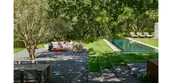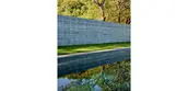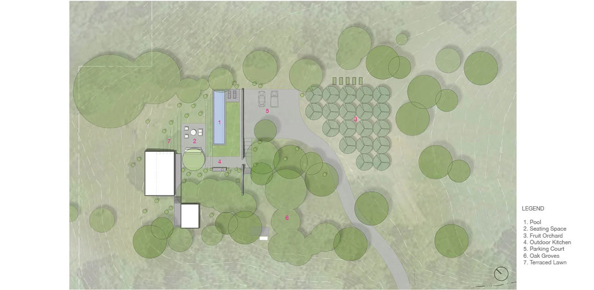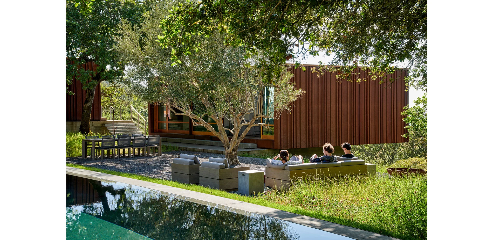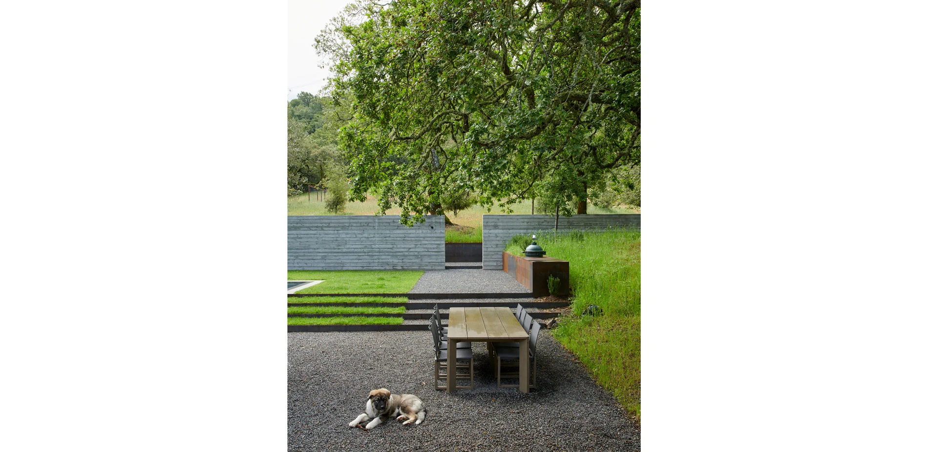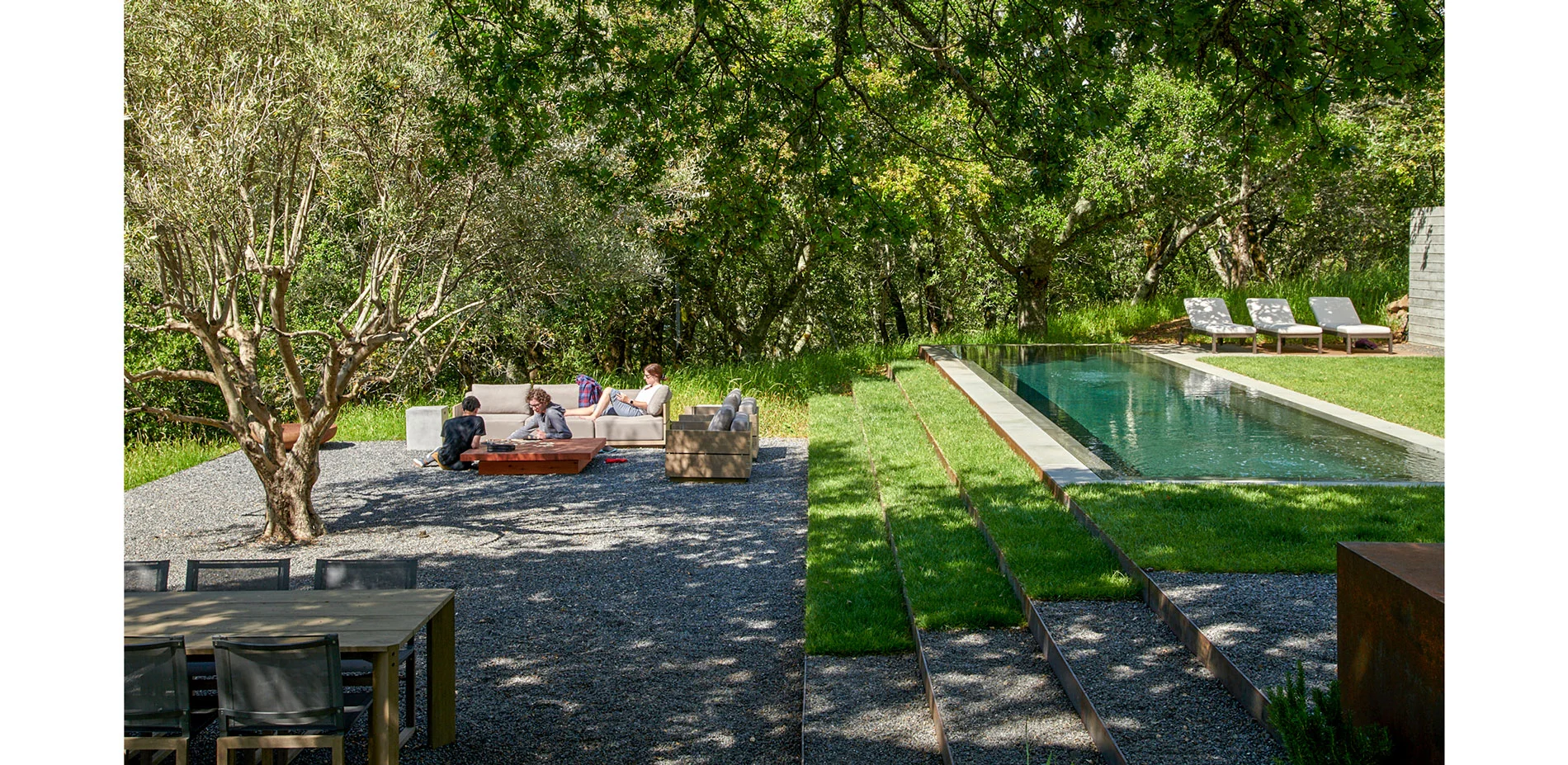 Hardscape materials comprised of natural stone, weathered steel, and board-formed concrete gently impose on the naturally beautiful and ecologically conserved site. The precisely crafted board-formed concrete wall that separates journey from relaxation, vehicle from pedestrian, holds a wide portal to the heart of the project, a courtyard that includes an outdoor kitchen, pool, aggregate-paved seating areas, and a terraced lawn. Each material change in this zone is crisply executed such that soft, hard, textured or liquid surfaces lend maximum contrast to the overall aesthetic of the space, calming the senses with restraint. To relax the orthogonal nature of the space, a lone, aged olive tree resides in the lawn as sculpture on a plinth. Along the edges of the space, oaks and grasses envelope and transition the designed intervention back into nature.