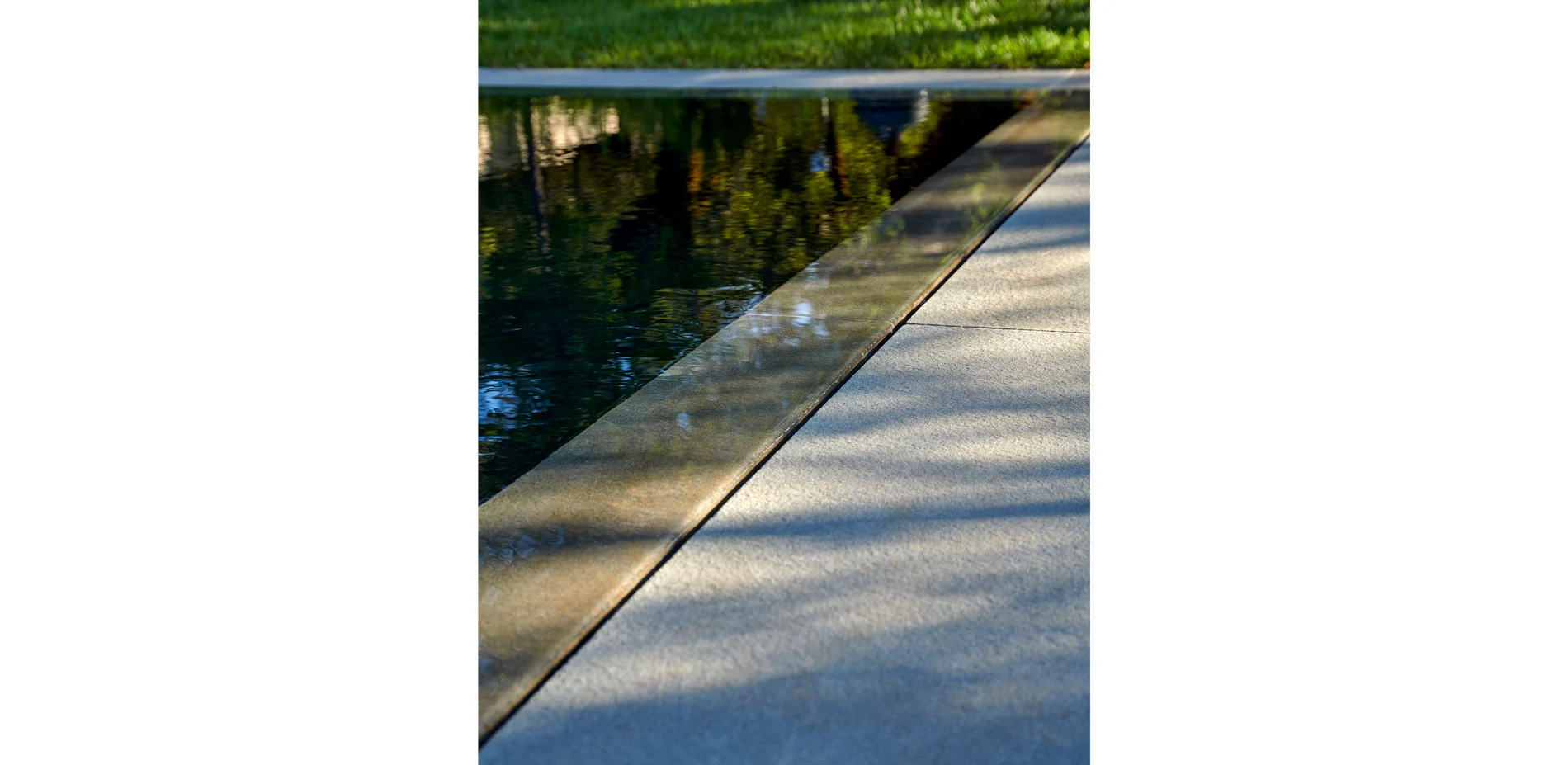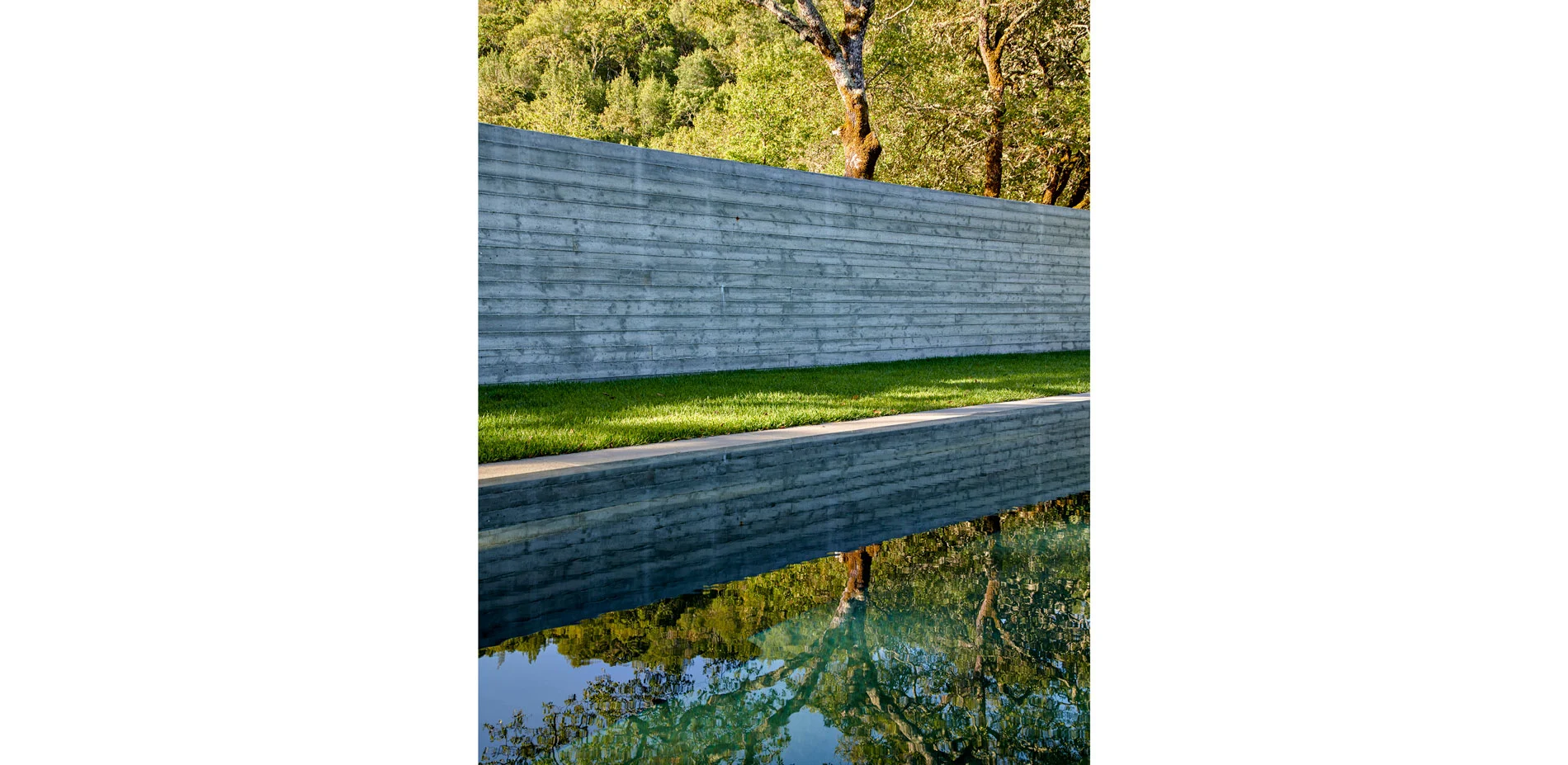 The small swimming pool features a bluestone surround and zero-edge detailing to maximize the mirrored surface of water to reflect the adjacent oaks and partly cloudy skies above. The pool rests, completely hidden from the motor court beyond, at the low side of the bisecting board-formed concrete wall. A unique in-floor system reveals an emergent pool cover that floats on the water’s surface, secured at the edges, in the evenings or when the owners are back in the Bay Area. This safety cover helps to maintain the water’s temperature and keep the neighboring fauna at bay.