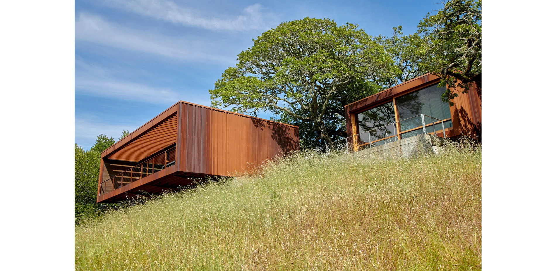 Above the dwelling spaces, a central permeable aggregate parking court is anchored into the hillside, hidden by the concrete wall. Weathered steel steps along the backside of the wall follow a steel retaining wall that acts to preserve a lone, sculptural oak at the portal to the living spaces below. These elements lie below a small fruit tree orchard and garden that are fenced by a simple weathered steel frame with agricultural mesh for deer protection along the upland slope.
