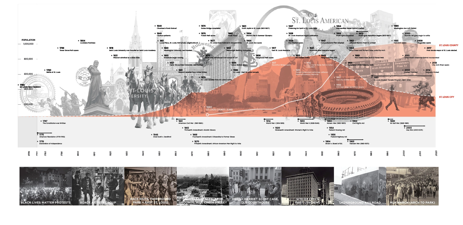 Downtown St. Louis is divided. Today, a shallow valley running east to west from Forest Park to the Mississippi River through the center of the city holds the infrastructure of the 20th century: freeways slip fluidly alongside bundled freight, regional, and commuter rail, each with their attendant interchanges, grade-separations, switching yards, and security. These strands connect the city to its region but create a physical and psychological barrier between the neighborhoods to the north and south. As in so many other cities around the US, this infrastructural void sits atop a neighborhood razed, a riparian ecology interred.