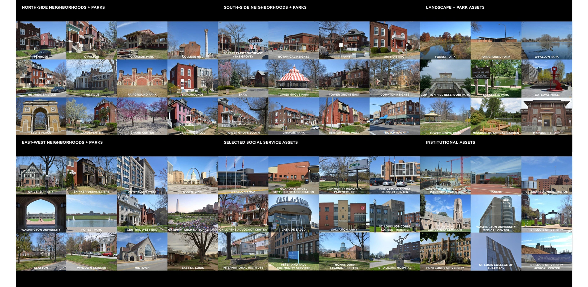 As part of the competition process, the GRG organized a number of stakeholder group workshops representing industry, commerce, and community groups. St. Louis is home to world-class institutions whose heritage linking to its preeminence as a river and rail city in the early 20th century. These institutions are still relevant, and we sought their input as a point of departure in our masterplan. A concentration of higher education institutions including Washington University, Wash U Med Center, St. Louis University, SLU Med Center, Harris-Stowe State University, and SLU Law School draw all levels of employment as well as student residents. Grand Arts District with its historic facilities like the Fox Theatre (1929) and Powell Symphony Hall (1925) along with newer additions like the Pulitzer Arts Foundation (2001) and the Contemporary Art Museum St. Louis (1980, 2004), are anchors for a newly blossoming arts scene. Emerging and established tech industries are bringing new entrepreneurship and infilling derelict spaces in innovative ways. Though many of these assets are located within the central east-west corridor of the city, they remain disconnected islands in the center of the St. Louis.