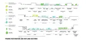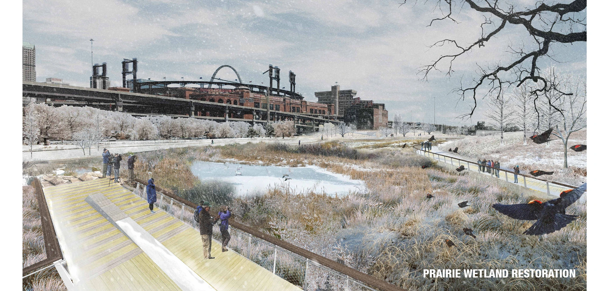 The hydrology of the central greenway was analyzed for opportunities to reduce loads on the existing hard infrastructures. The low railway basin site is topography ideal for intercepting stormwater, thus reestablishing native communities of prairie, woodland, riverside, and wetland. Tallgrass prairie habitat, reclaimed from parking lots and storage yards, will support local floral and faunal biodiversity and provide appropriate habitat for migrating birds. Active urban forest and prairie along the Greenway will provide important ecosystem and cultural services to the St. Louis area. Public interaction with newly visible habitats and species can be explored over boardwalks, trails, and bridges beside wetlands and drainage ways, reducing the barriers that prevent residents from enjoying nature in the city.