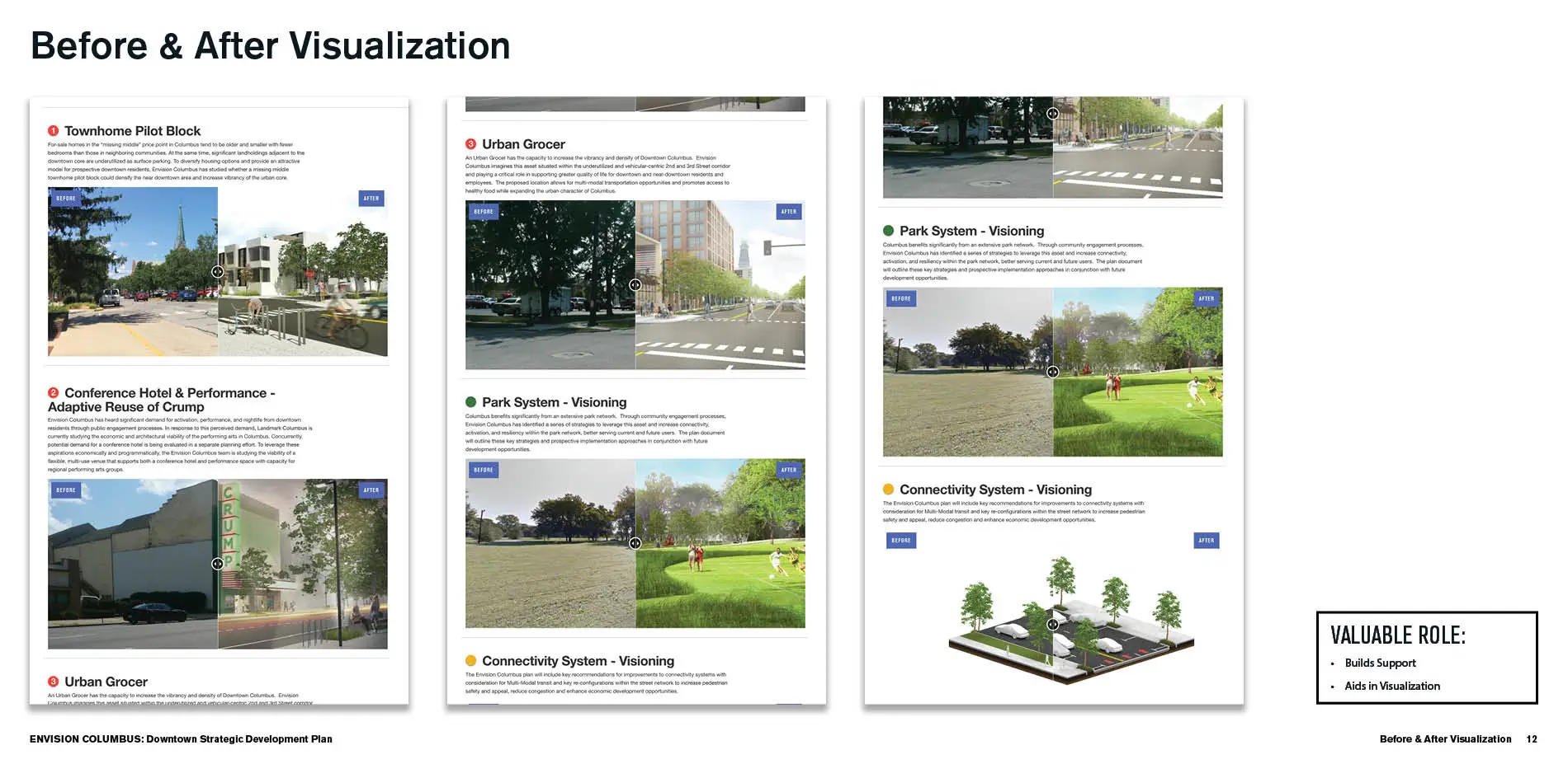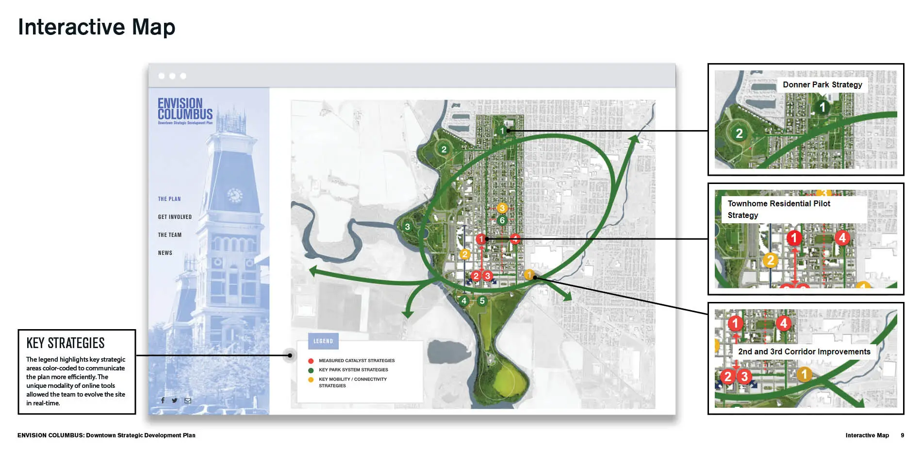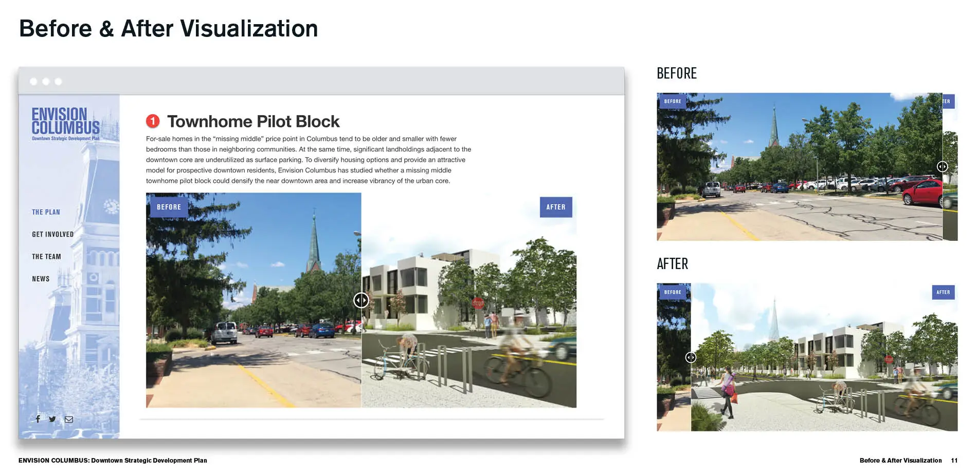 The online platform was also an important conduit for sharing the progression of the Strategic Development Plan, allowing citizens to continue to engage and follow developments throughout the process. At the end of the planning process, EnvisionColumbus.org became the home of the final plan, available to be downloaded and accessed by all. Interactive before/after imagery and rendered perspectives not only engage users but also help citizens to visualize specific proposed interventions identified as catalysts for economic and social stimulation. As the final plan proposes multi-scalar strategies, EnvisionColumbus.org continues to be an important communication tool, offering a venue for ongoing sharing and alignment among the community around realizable concepts and future implementation.