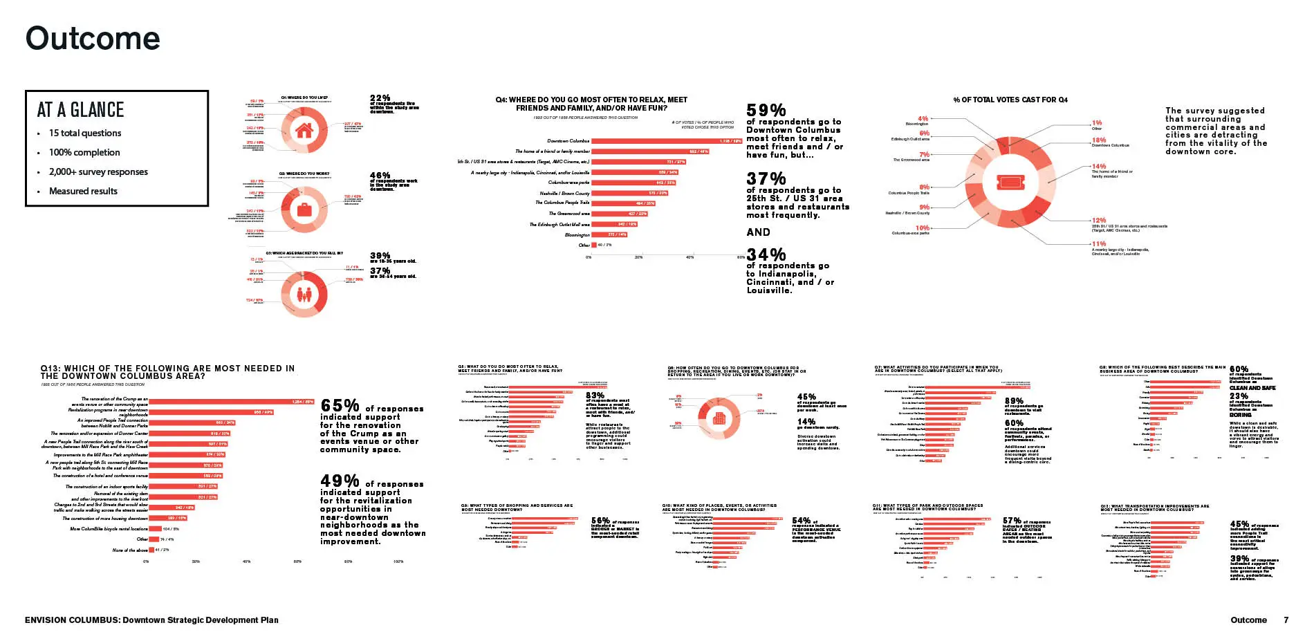 The survey created for EnvisionColumbus.org was constructed to gather input from citizens with the understanding that users have limited time and attention spans. The survey collected pertinent and focused data to help the planning team identify how Downtown Columbus is currently utilized, and how it can evolve to better serve its citizens. The survey posed a total of fifteen questions; more than 2,000 citizens responded, spending an average time of a just over fifteen minutes on the exercise with a 100% completion rate. The design team deemed it essential that the website function seamlessly on a variety of hand-held devices, recognizing that nearly 80% of Americans own a smartphone. Statistical feedback demonstrated that approximately 25% of responses to the EnvisionColumbus.org survey were completed through a smartphone device, leveraging citizen participation in providing insight and feedback.