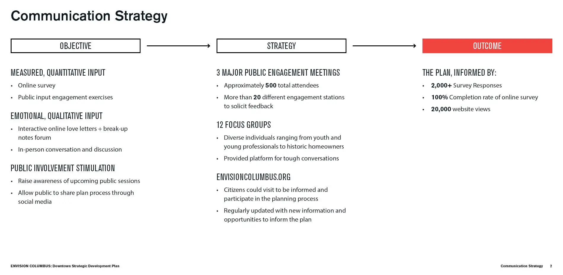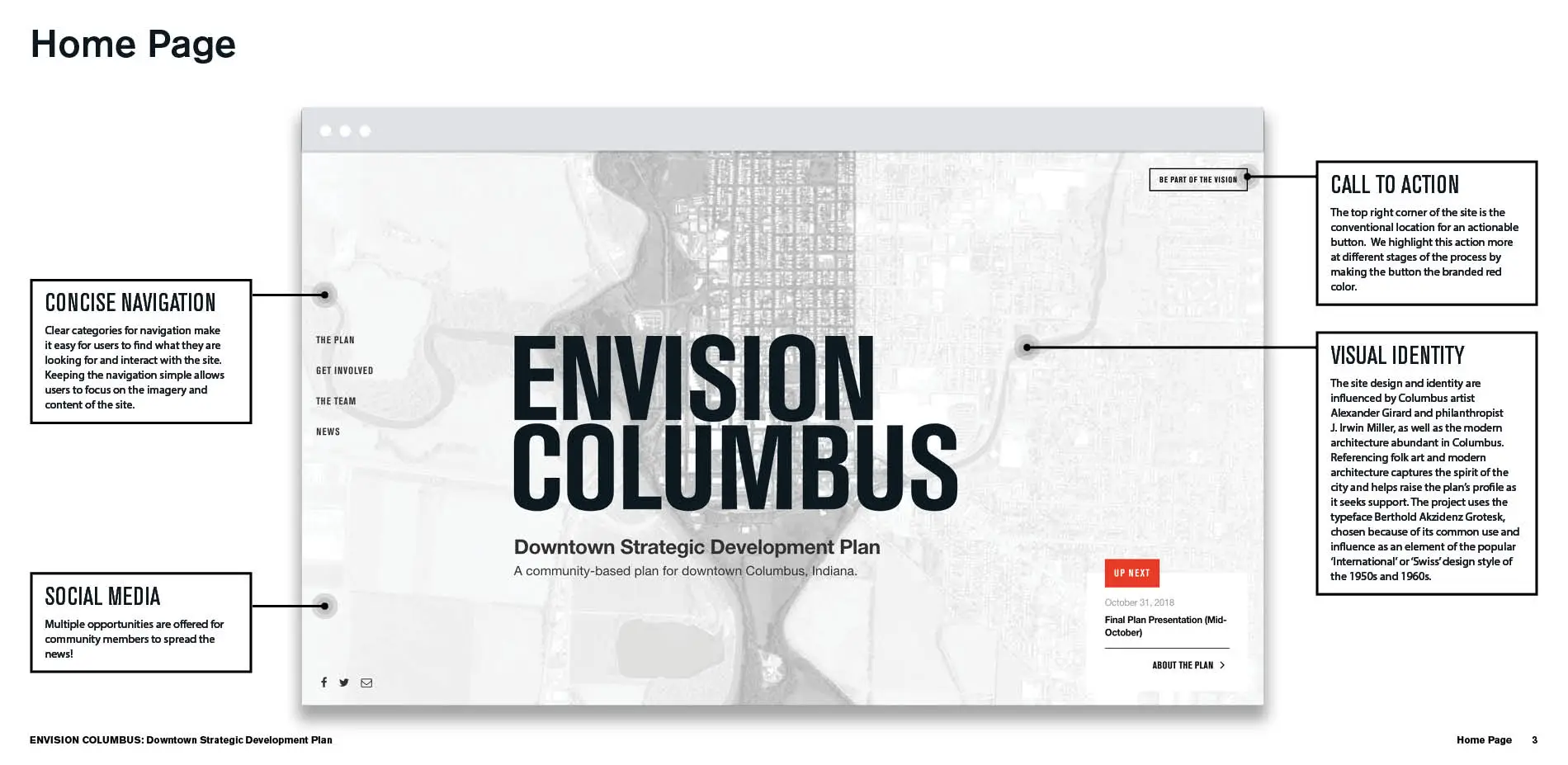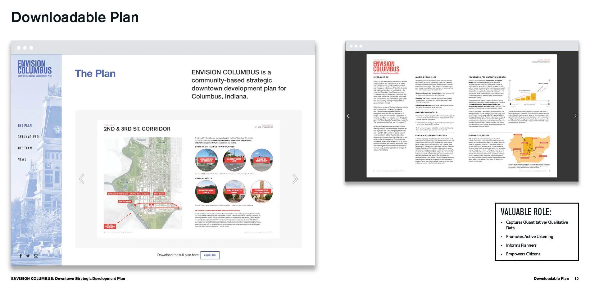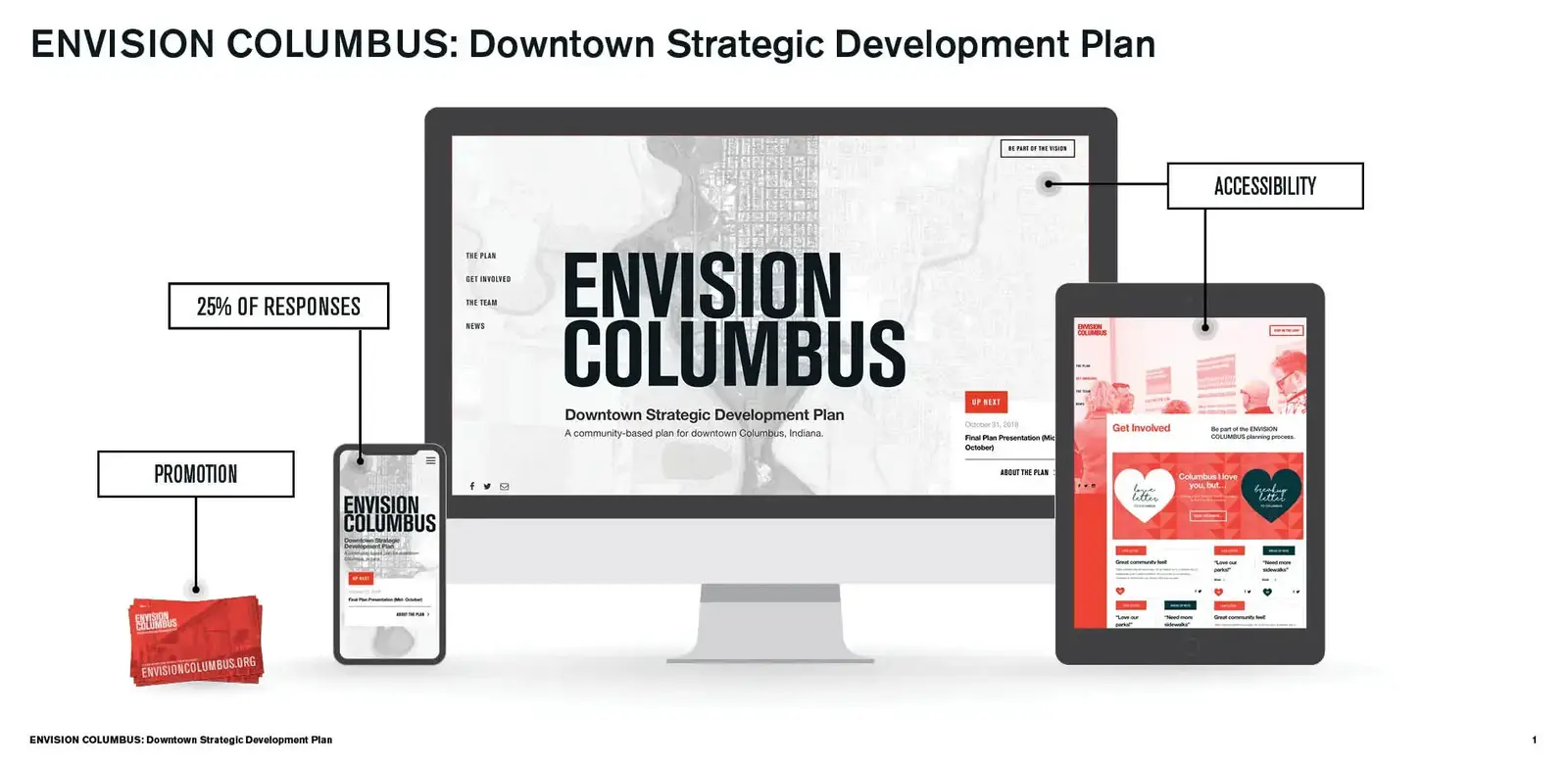EnvisionColumbus.org is an interactive website designed to facilitate broad public engagement across a wide range of diverse constituencies during the creation of the new Downtown Strategic Development Plan for Columbus, Indiana. The website builds upon the City's legacy of centering the voices of citizens in shaping the City itself. It represents a twenty-first-century approach to the kind of community building and alignment that has defined Columbus's planning history. The website was a critical component in a robust overall strategy, complementing traditional analog exercises that engaged hundreds of citizens during in-person meetings. An inclusive platform for the voices of an expansive and changing citizenry, the site ultimately engaged more than 2,000 survey responses and 15,500 unique views. The site's compelling visual language and intuitive architecture offered an invaluable venue for gathering data and constructive feedback. Taking advantage of modern modes of communication while maintaining a humanist approach, EnvisionColumbus.org represents an essential tool to the planning process, ultimately shaping a final plan that is both beloved by and reflective of its citizenry.