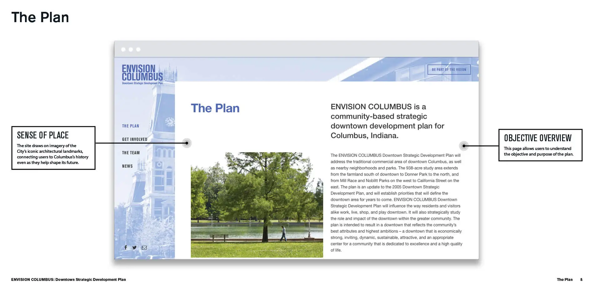 The planning team understood that the voices of citizens were vital to a successful process, and EnvisionColumbus.org was designed with the aim of ensuring a final plan that would be both beloved by and reflective of the community. To that end, the team built a site that is not only robust with information and opportunities for feedback, but that presents those elements through a beautiful, easy-to-navigate interface that users could access at their convenience throughout the planning process. Balancing compelling visual language and thoughtful explorations for dialogue, EnvisionColumbus.org allowed the planning team to gather qualitative and quantitative information that was essential in shaping the final plan.