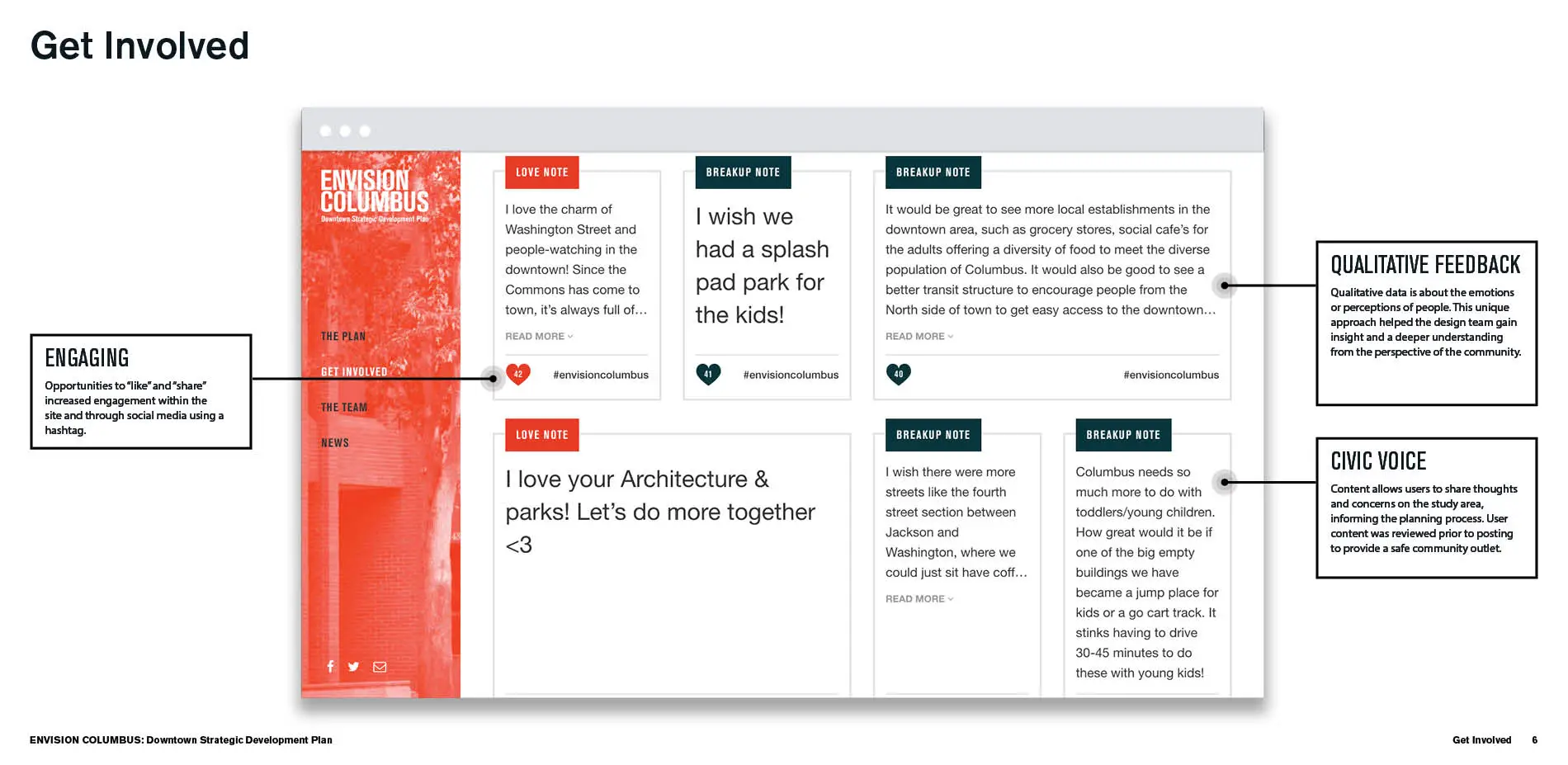 Among the opportunities to engage offered by EnvisionColumbus.org was a forum that asked citizens to write a "love letter" or "break-up note" to Downtown Columbus, including things they love about where they lived, or how it must improve to better serve them. Users could also "like" and therefore elevate each other's letters and notes, providing a higher level understanding of trends in community thinking. In addition to the "like" button, there was also an option to "share" on social media using the hashtag #envisioncolumbus. The amplification through social media assisted in sharing and hearing feedback in unique ways. The combined approach in gathering quantitative and qualitative information ultimately provided data that was both wide-reaching and deep.