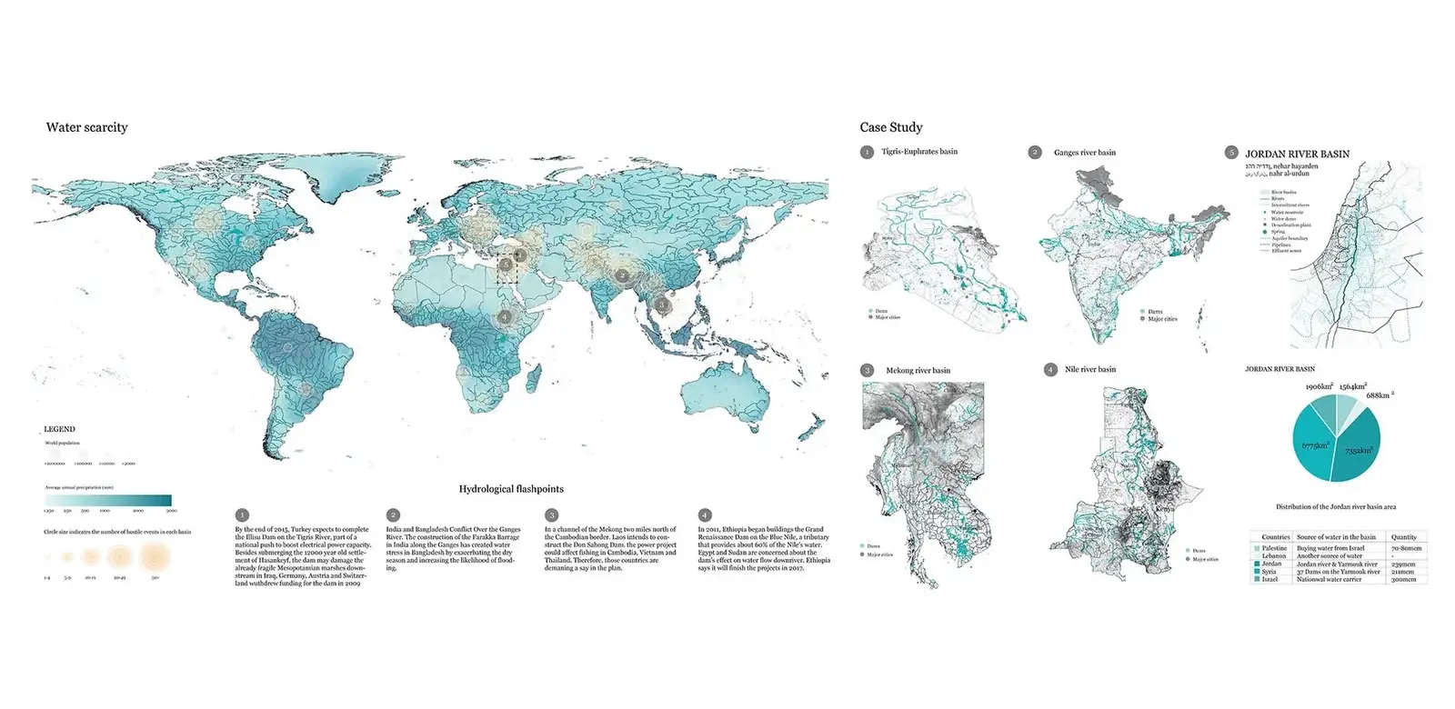 This project visualises the Jordan River Basin's water availability and vulnerability with compilation of geopolitical and landscape data by using a data analysis tool - Geographic Information System (GIS). Water availability is based on a series of criteria about geographical and technical features: The criteria used to define water availability include (1) precipitation, (2) landuse and permeability of land, (3) soil type, (4) availability of relevant technologies and (5) extraction of groundwater. While water vulnerability is based on criteria sensitive to geopolitical tensions and the risk level of becoming a militarized zone: The criteria used to define water vulnerability include (1) hydrological position, (2) current political power, (3) regional treaties (and its bias) and (4) disconnection from water infrastructure. With a combination of the the 2 sets of criteria, a resultant "water security" is being measured and visualised. The modelling formula: water availability minus water vulnerability equals to water security.