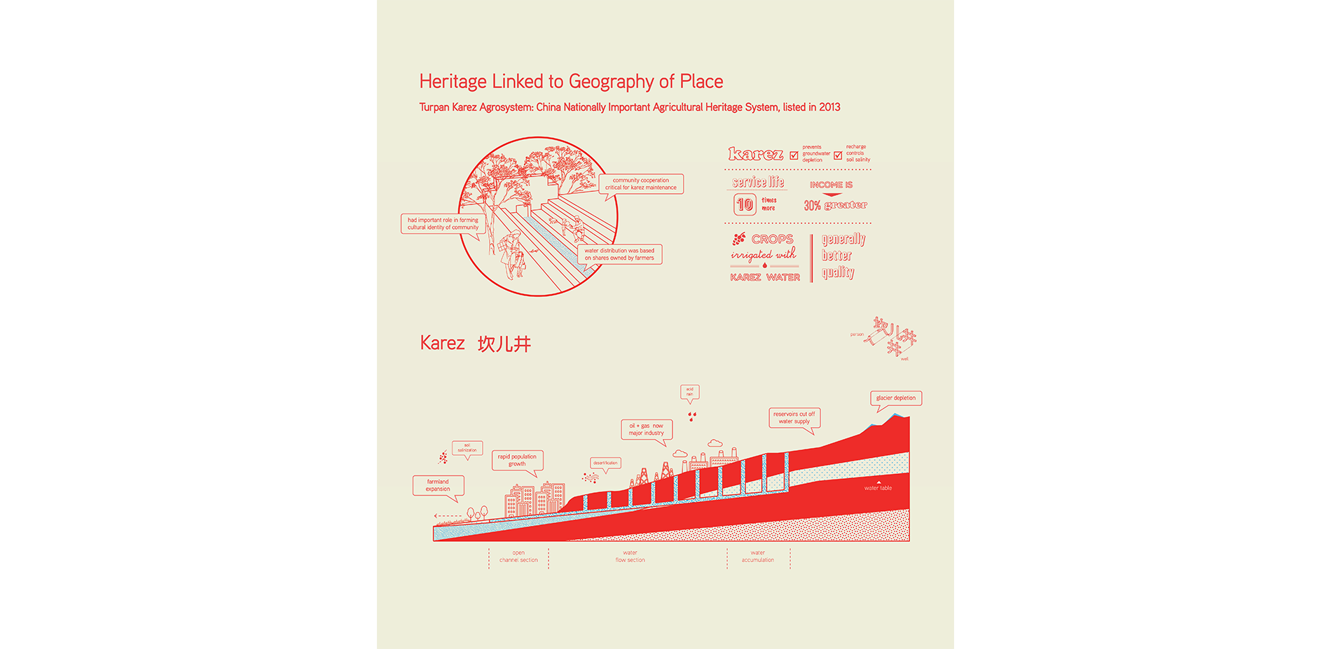 This project investigates how cultural heritage can be conserved within the Turpan Prefecture of Xinjiang, China in which the karez heritage agrosystem intersects with other types of landscape based heritage. With the agricultural techniques of Turpan recognized as a Nationally Important Agricultural Heritage System, and with Turpan's karez wells on the nomination list for World Heritage inscription, there is opportunity to rethink how cultural heritage is managed through ecological approaches, setting an integrated framework for addressing both ecological and cultural heritage management.