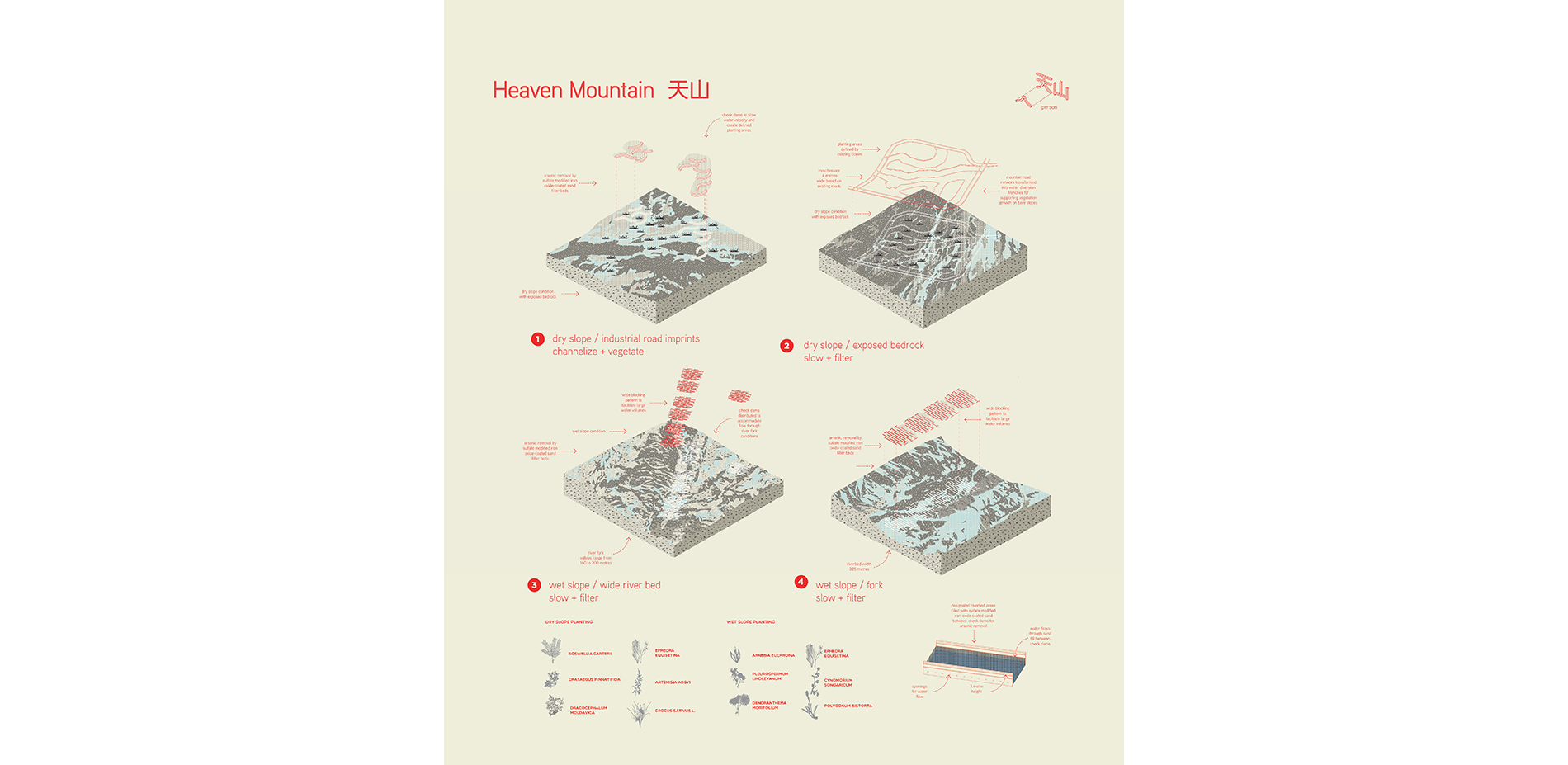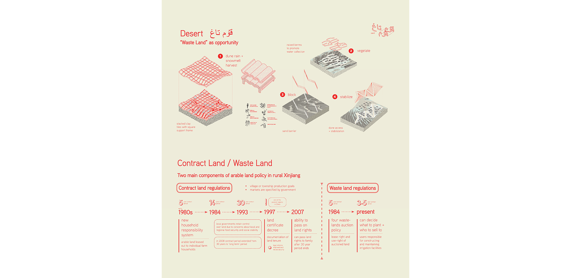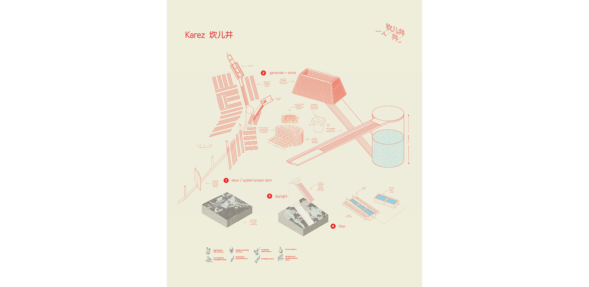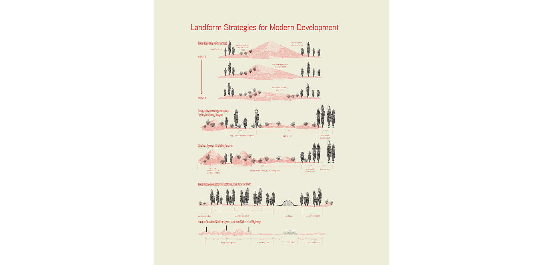 With significant threats to the cultural heritage of the Turpan Prefecture of Xinjiang, China, arising from desertification, acid rain, soil salinization, agriculture, and tourism, this comprehensive plan offers design-based strategies for the region’s varied landscapes that include sand dunes, mountains, fields, deserts, and the intricate, ancient, culturally indispensable karez system of groundwater distribution. Relying on in-depth, explorations of heritage, place, and human and animal life, this study, although regional in scale, promises to restore the ancient connections between people, nature, and landscape in contemporary life.