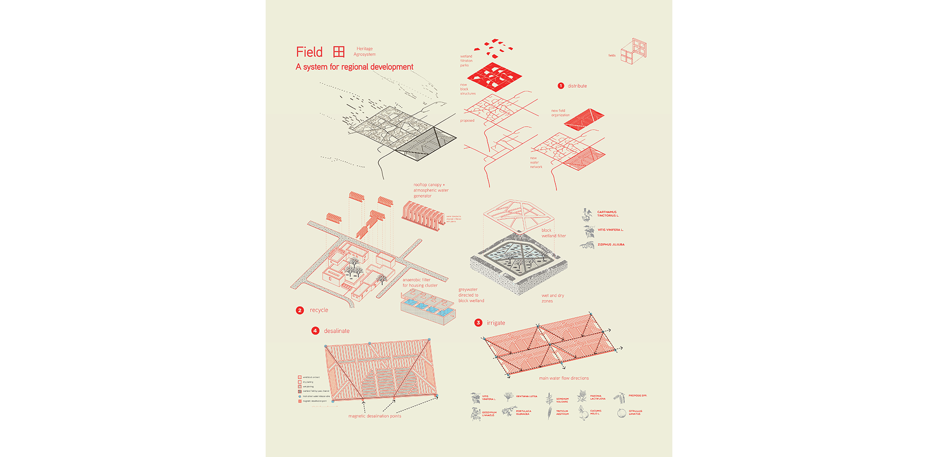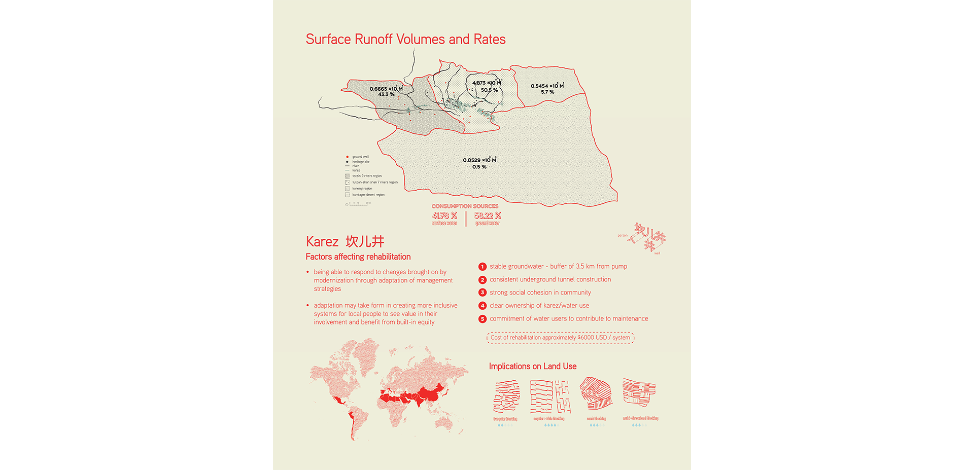 Cartographic data on heritage sites and regional characteristics of the study area were utilized to investigate factors causing ecological degradation. The use of GIS mapping and hydrological analysis aided in the formation of a design proposal to improve ecological conditions and mitigate agricultural impacts on heritage sites. An analysis of how communities and landscapes were spatially composed based on the distribution of karez water from other areas of the world also assisted with devising spatial design strategies based on researched landform patterns.
