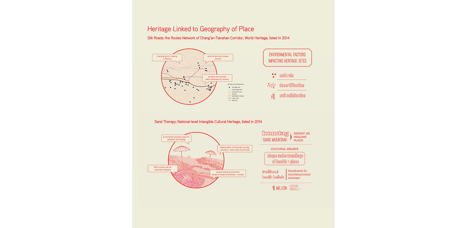 The continued practice of heritage based rituals, researched through anthropological, ethnographic and medicinal sciences were investigated to offer insight into how the dynamics of mediating heritage identities exist for culture and how design can contribute to enabling the continued practice of heritage within the landscapes in which local traditions are rooted in. Cultural practices with heritage designation were investigated; wherein their intrinsic ties to landscape and defined spatial geographies were examined to understand how Turpan operates and can be sustained as a place for living and healing.