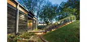 Stair: The entry stair is a "bridge" stair supported by truss/handrails laser cut from a single sheet of ¼" steel. Cedar boards "float" from the trusses to create each tread.