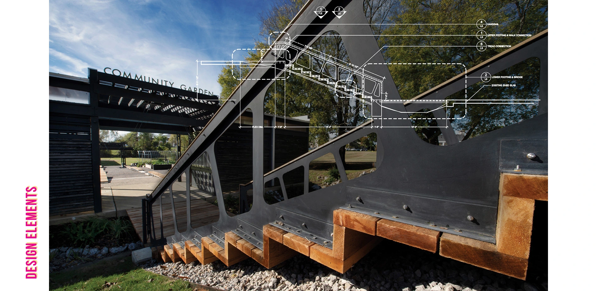 There are relatively few materials used in the garden. While a very difficult choice, cedar was chosen as the primary bed material for its longevity, compliance with organic agricultural production, and aesthetic value. Locally harvested, crushed limestone was used for the walking surfaces. Limestone blocks were also used to face the gabion baskets to hide the recycled concrete blocks used to fill the majority of the baskets. The plaza was made of reclaimed concrete pavers collected from a demolished, nearby site. The pavers were set on a compacted sand and limestone base. All of the structures were built from locally harvested and treated southern pine. All structures were finished with a black stain or painted with one of two accent colors. The stair used cedar planks hanging from two, steel truss/handrails that were laser cut from a single plate by a local vendor. Cedar cut-offs from the stair were attached to aluminum paver edging to make caps for the gabion baskets.